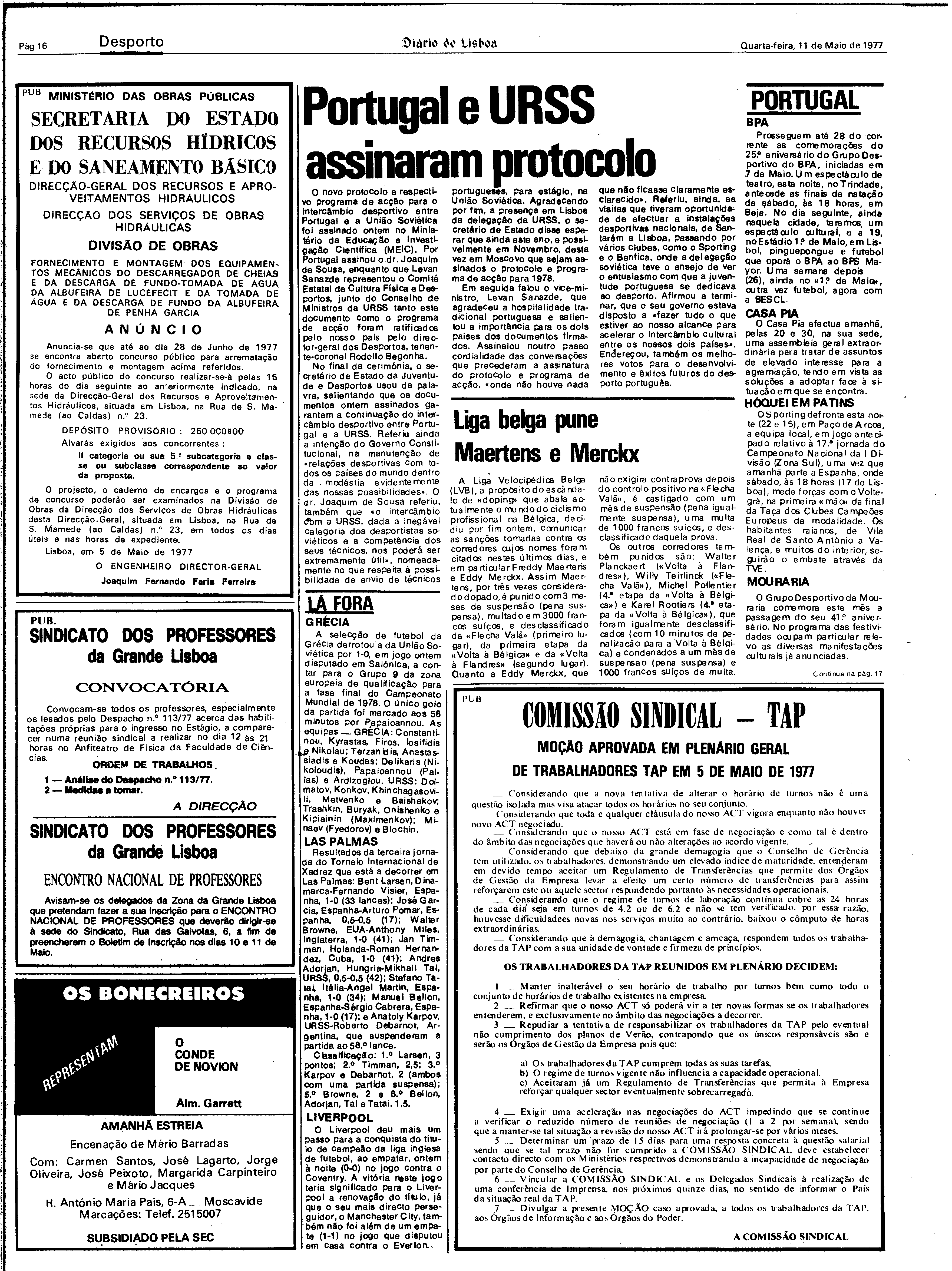 Instituição: Fundação Mário Soares e Maria Barroso Pasta: 06827.177.27836Título: Diário de LisboaNúmero: 19350Ano: 57Data: Quarta, 11 de Maio de 1977Directores: Director: António Ruella Ramos; Director Adjunto: Fernando Piteira SantosFundo: DRR - Documentos Ruella RamosTipo Documental: IMPRENSADireitos: A publicação, total ou parcial, deste documento exige prévia autorização da entidade detentora.