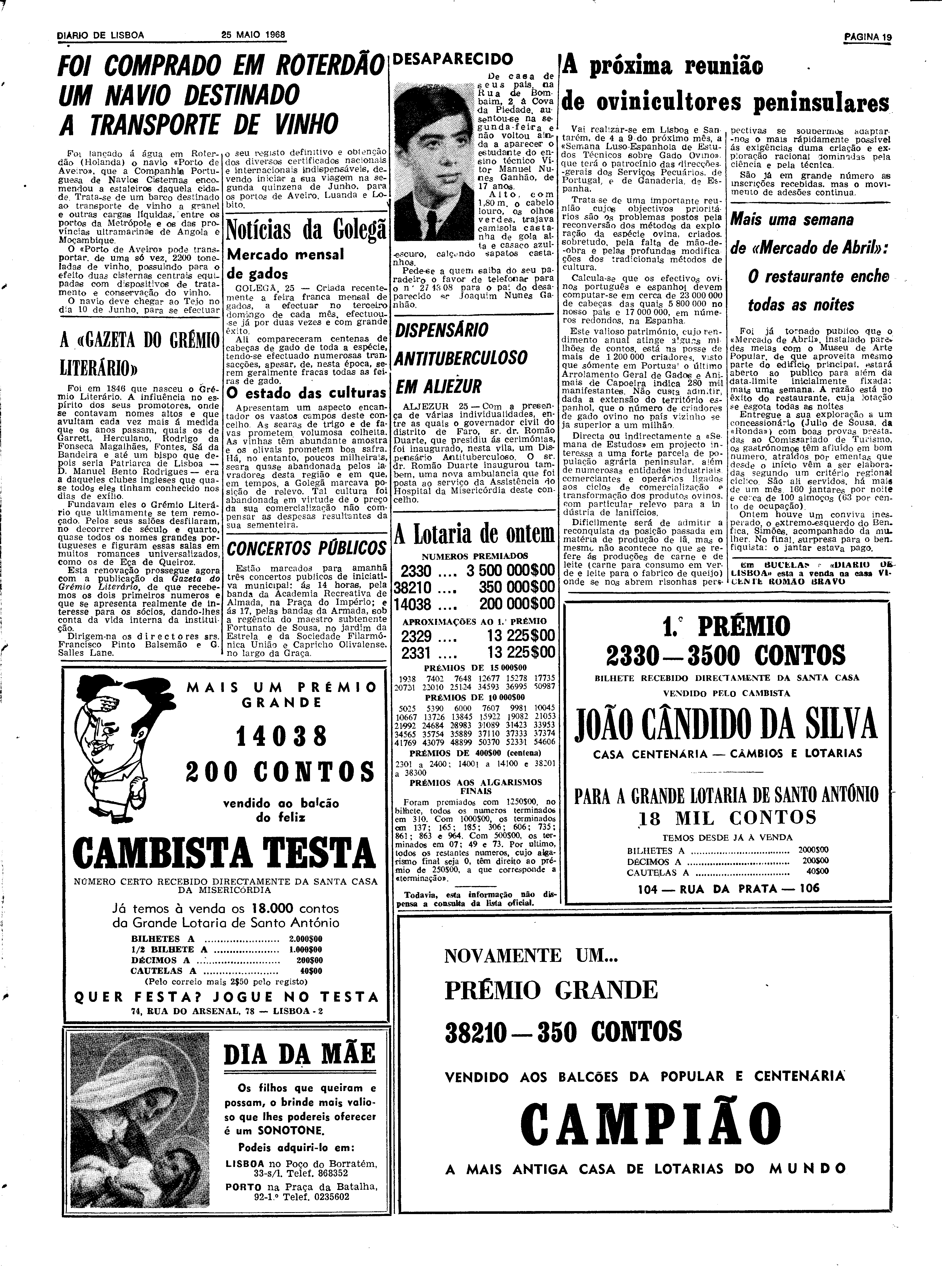 Instituição: Fundação Mário Soares e Maria Barroso Pasta: 06588.126.22323Título: Diário de LisboaNúmero: 16319Ano: 48Data: Sábado, 25 de Maio de 1968Directores: Director: António Ruella RamosEdição: 1ª ediçãoObservações: Inclui supl. "Diário de Lisboa Magazine".Fundo: DRR - Documentos Ruella RamosTipo Documental: IMPRENSADireitos: A publicação, total ou parcial, deste documento exige prévia autorização da entidade detentora.