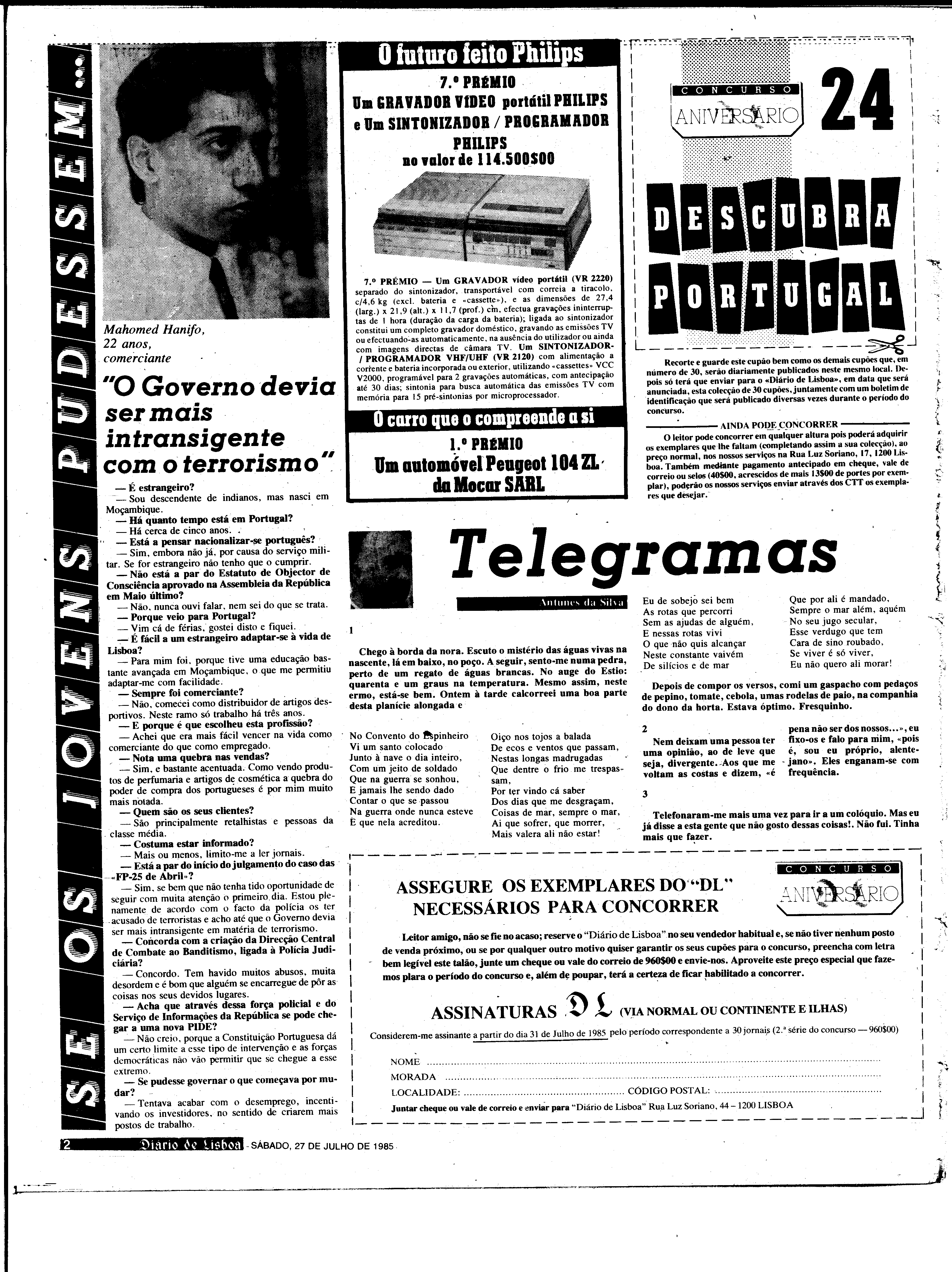 (1985), "Diário de Lisboa", nº 21819, Ano 65, Sábado, 27 de Julho de 1985, Fundação Mário Soares / DRR - Documentos Ruella Ramos, Disponível HTTP: http://hdl.handle.net/11002/fms_dc_1416 (2025-12-17)