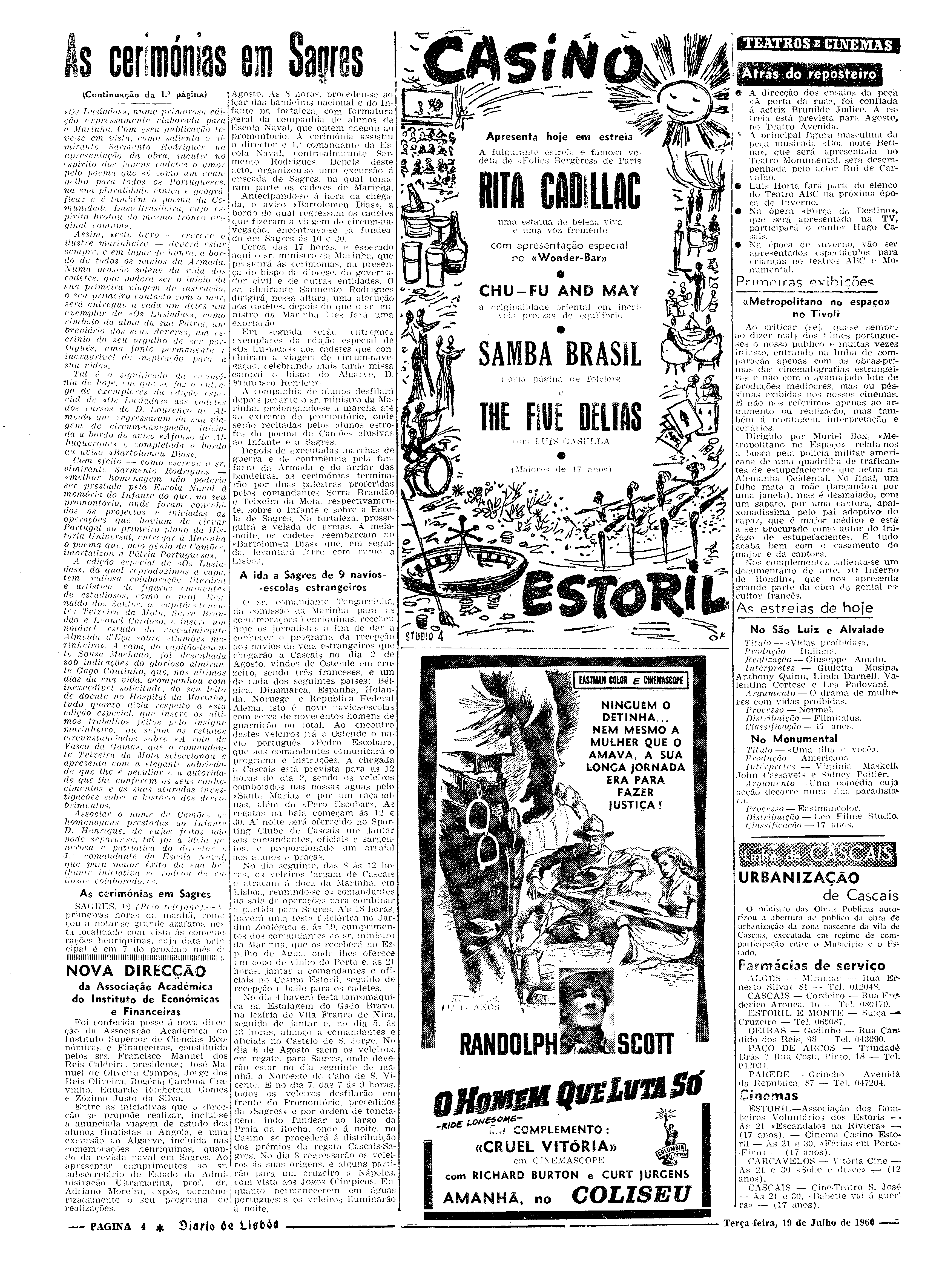 Instituição: Fundação Mário Soares e Maria Barroso Pasta: 06539.077.16862Título: Diário de LisboaNúmero: 13509Ano: 40Data: Terça, 19 de Julho de 1960Directores: Director: Norberto Lopes; Director Adjunto: Mário NevesEdição: 1ª ediçãoFundo: DRR - Documentos Ruella RamosTipo Documental: IMPRENSADireitos: A publicação, total ou parcial, deste documento exige prévia autorização da entidade detentora.