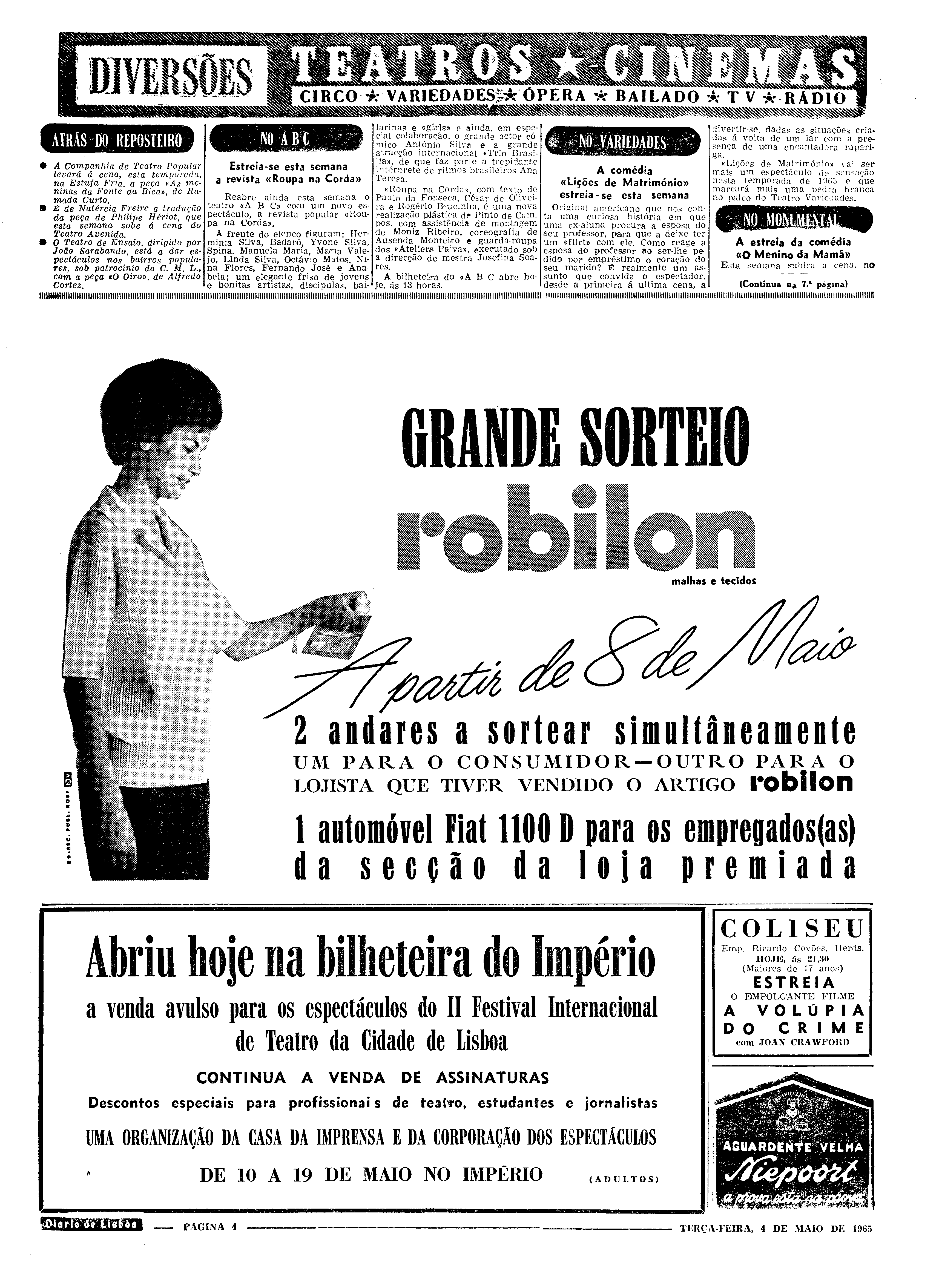 Instituição: Fundação Mário Soares e Maria Barroso Pasta: 06559.097.19535Título: Diário de LisboaNúmero: 15223Ano: 45Data: Terça, 4 de Maio de 1965Directores: Director: Norberto Lopes; Director Adjunto: Mário NevesEdição: 1ª ediçãoObservações: Inclui supl. "Diário de Lisboa Juvenil".Fundo: DRR - Documentos Ruella RamosTipo Documental: IMPRENSADireitos: A publicação, total ou parcial, deste documento exige prévia autorização da entidade detentora.