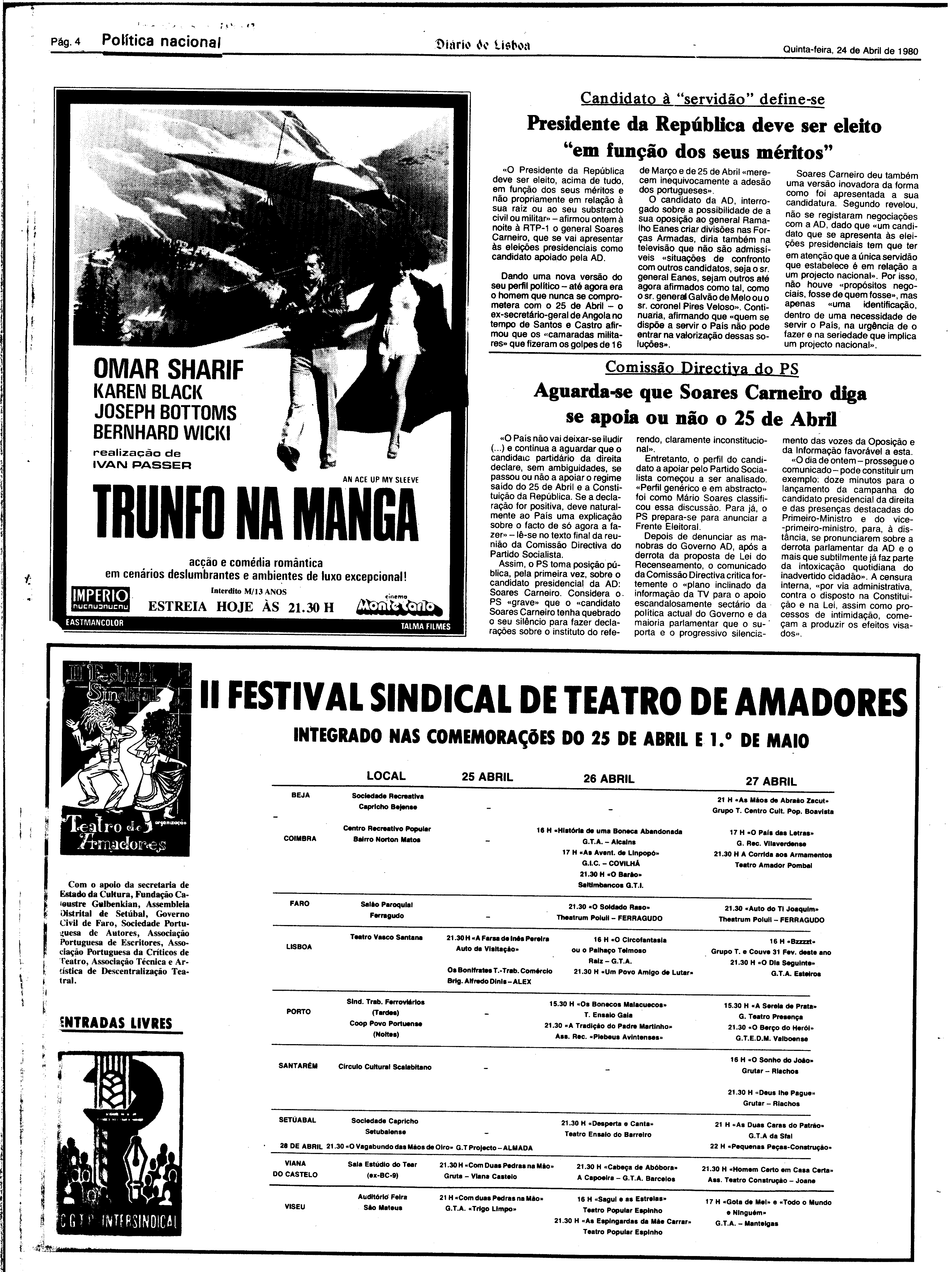 Instituição: Fundação Mário Soares e Maria Barroso Pasta: 06833.183.28723Título: Diário de LisboaNúmero: 20239Ano: 60Data: Quinta, 24 de Abril de 1980Directores: Director: António Ruella Ramos; Director Adjunto: Fernando Piteira SantosObservações: Inclui supl. "Concurso DL".Fundo: DRR - Documentos Ruella RamosTipo Documental: IMPRENSADireitos: A publicação, total ou parcial, deste documento exige prévia autorização da entidade detentora.