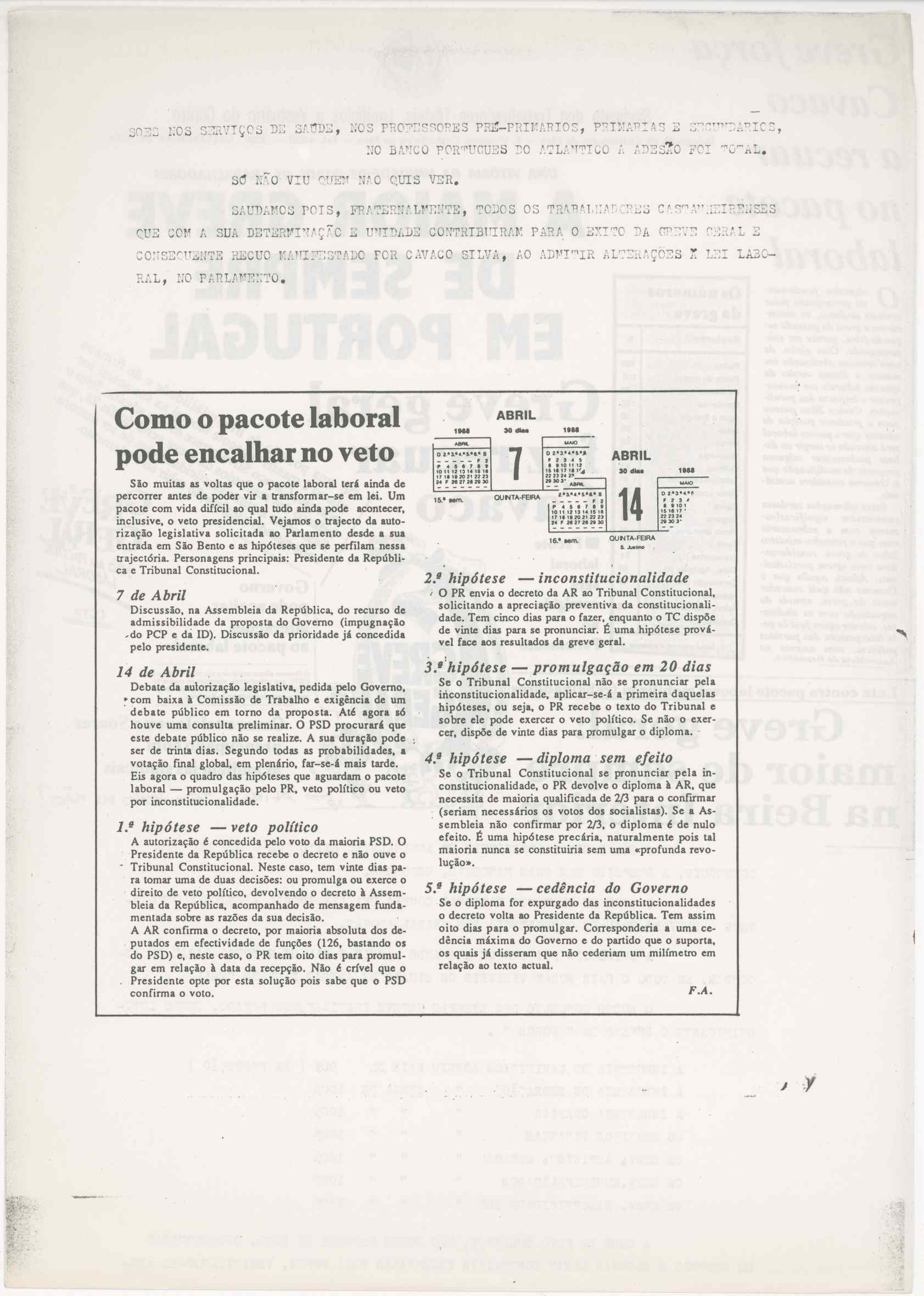 Instituição: Fundação Mário Soares e Maria Barroso Pasta: 09884.085Assunto: Comunicado do Sindicato dos Trabalhadores Têxteis, Lanifícios e Vestuário do Centro, divulgando recortes de imprensa sobre a adesão à greve geral de 28 de Março de 1988 contra o pacote laboral, e a adesão das indústrias no concelho de Castanheira de Pera.Data: Março de 1988Fundo: Kalidás BarretoTipo Documental: DocumentosDireitos: A publicação, total ou parcial, deste documento exige prévia autorização da entidade detentora.