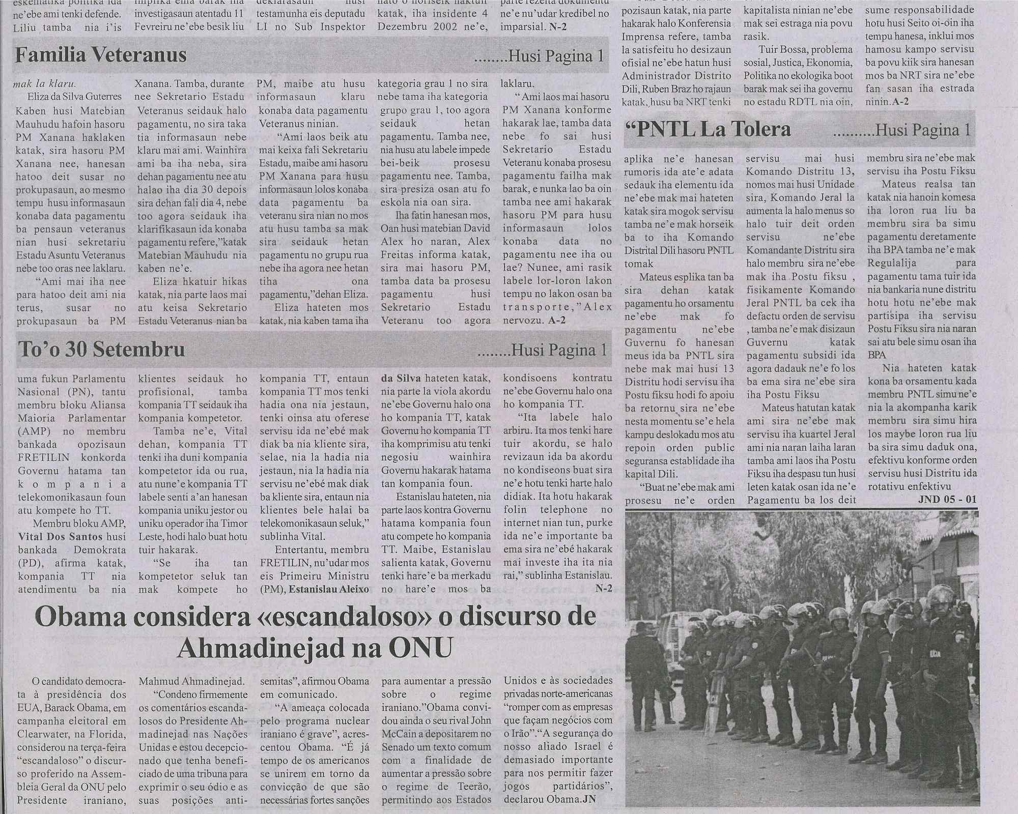 Instituição: Arquivo & Museu da Resistência Timorense Pasta: 10271.130Título: DiárioData: Quinta, 25 de Setembro de 2008Observações: anúncio na pág. 1; anúncio na pág. 3; anúncio na pág. 5; anúncio na última página; notícia na pág. 1; notícia na pág. 11; Fundo: Arquivo da Resistência Timorense - Jornais Timor TelecomTipo Documental: IMPRENSACota Original: DIA_2008_09_25Direitos: A publicação, total ou parcial, deste documento exige prévia autorização da entidade detentora.