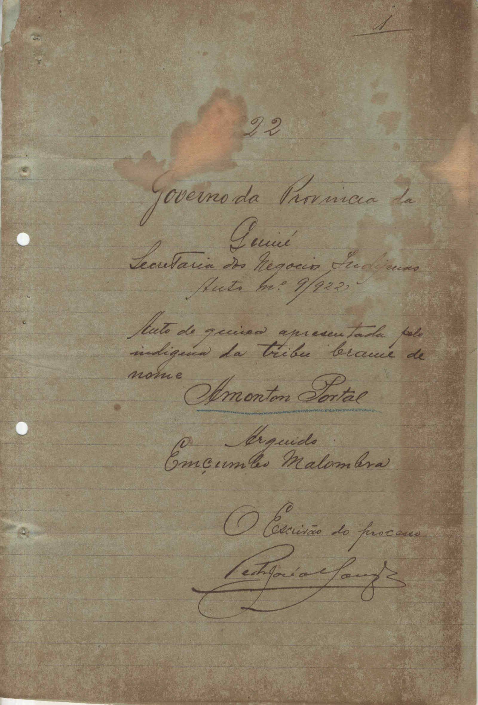 (1922), "Queixa do indígena Amonton Portal contra Emçumbo Malombra", Fundação Mário Soares / C1.6 - Secretaria dos Negócios Indígenas, Disponível HTTP: http://www.casacomum.org/cc/visualizador?pasta=10415.019 (2025-12-17)