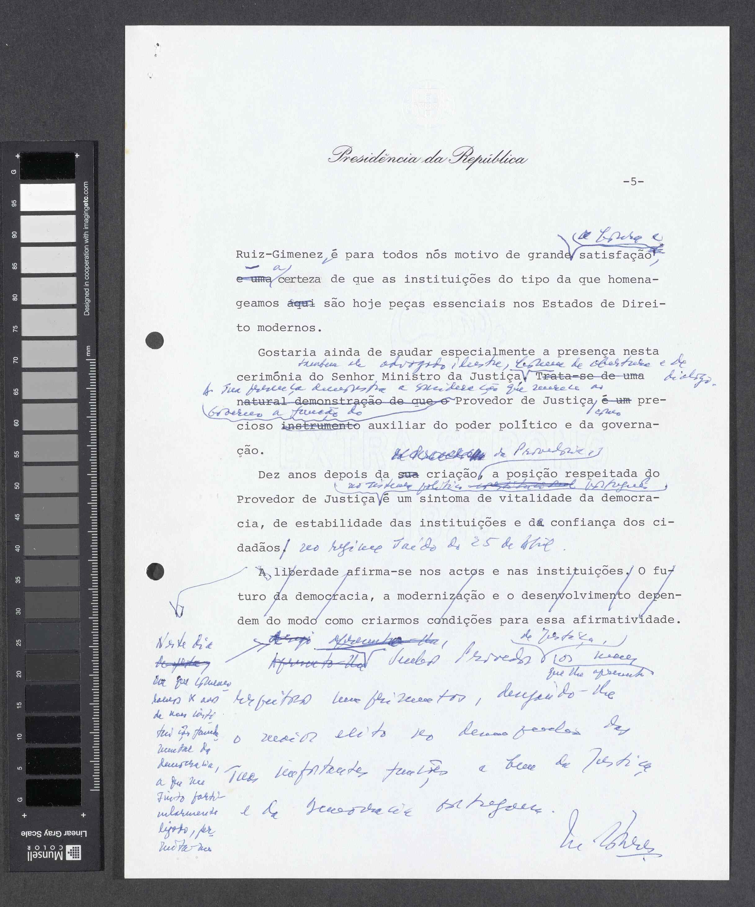 Instituição: Fundação Mário Soares e Maria Barroso Pasta: 00377.017.001Assunto: Texto manuscrito do Presidente da República, Mário Soares, com discurso proferido na sessão solene comemorativa do 10º aniversário da Provedoria da Justiça, em 2 de julho de 1986.Data: quarta, 2 de julho de 1986Fundo: Mário SoaresTipo Documental: DocumentosDireitos: A publicação, total ou parcial, deste documento exige prévia autorização da entidade detentora.