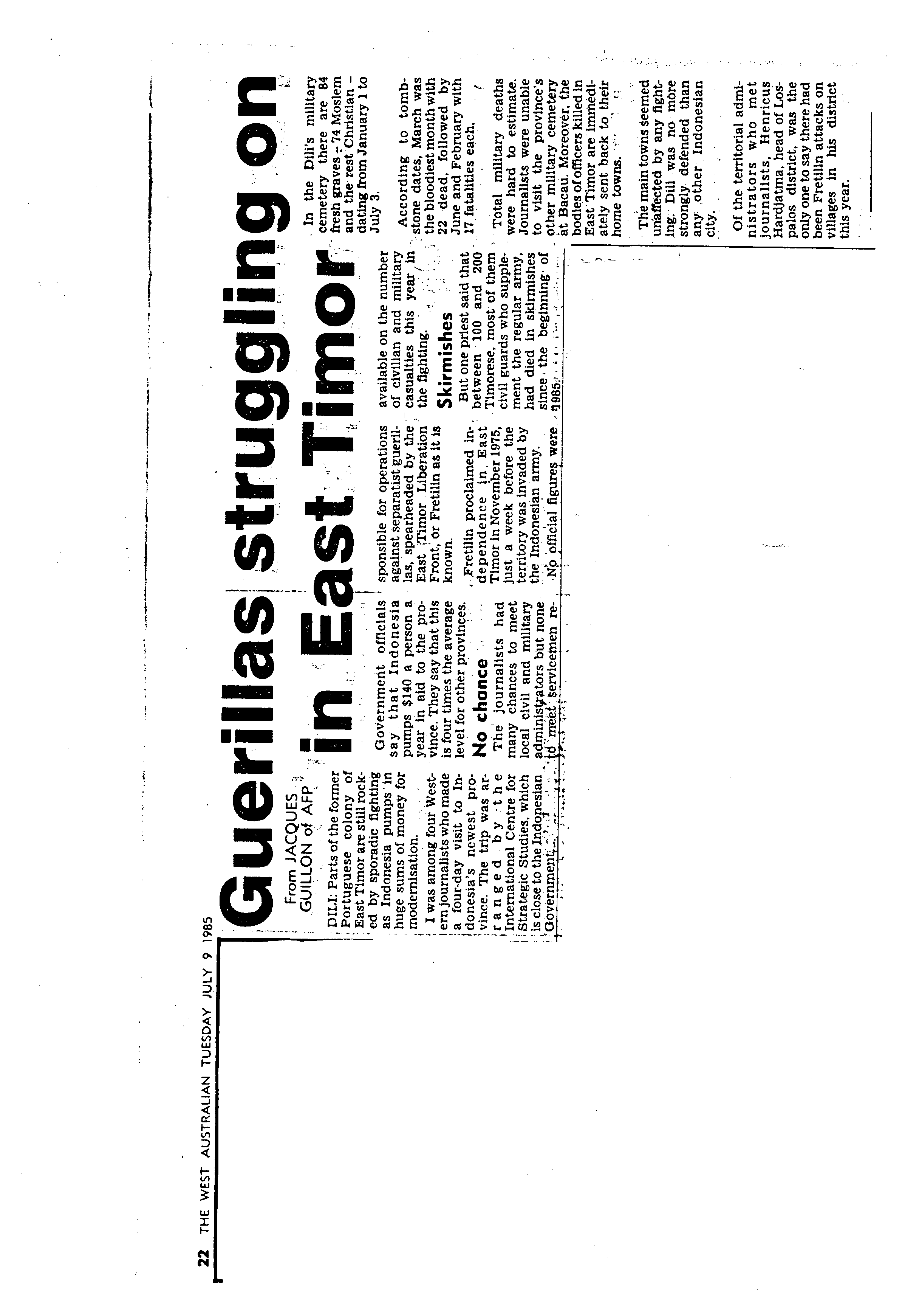 (1985-1985), "Agência France Press, The Age, The West Australian, The Bulletin, The Jakarta Post, The Canberra Times, Deutsches Allgemeines, The Sun, Financial Review, The Times of Papua New Guinea, Die Tageszeitung, Tribune, The Australian, Sunshine Coast Daily, The Courier-Mail, The Sunday Mail, Het Parool, De Waarheid, The Weekend Australian, The National Times, The Sydney Morning Herald, The International Herald Tribune, The Australian, Sunshine Coast Daily, Het Parool, De Waarheid, The Northern Territory News, The Melburn Sun, The Guardian", Junho de 1985 - Agosto de 1985, Fundação Mário Soares / Arquivo da Resistência Timorense - TAPOL, Disponível HTTP: http://hdl.handle.net/11002/fms_dc_144929 (2025-12-17)