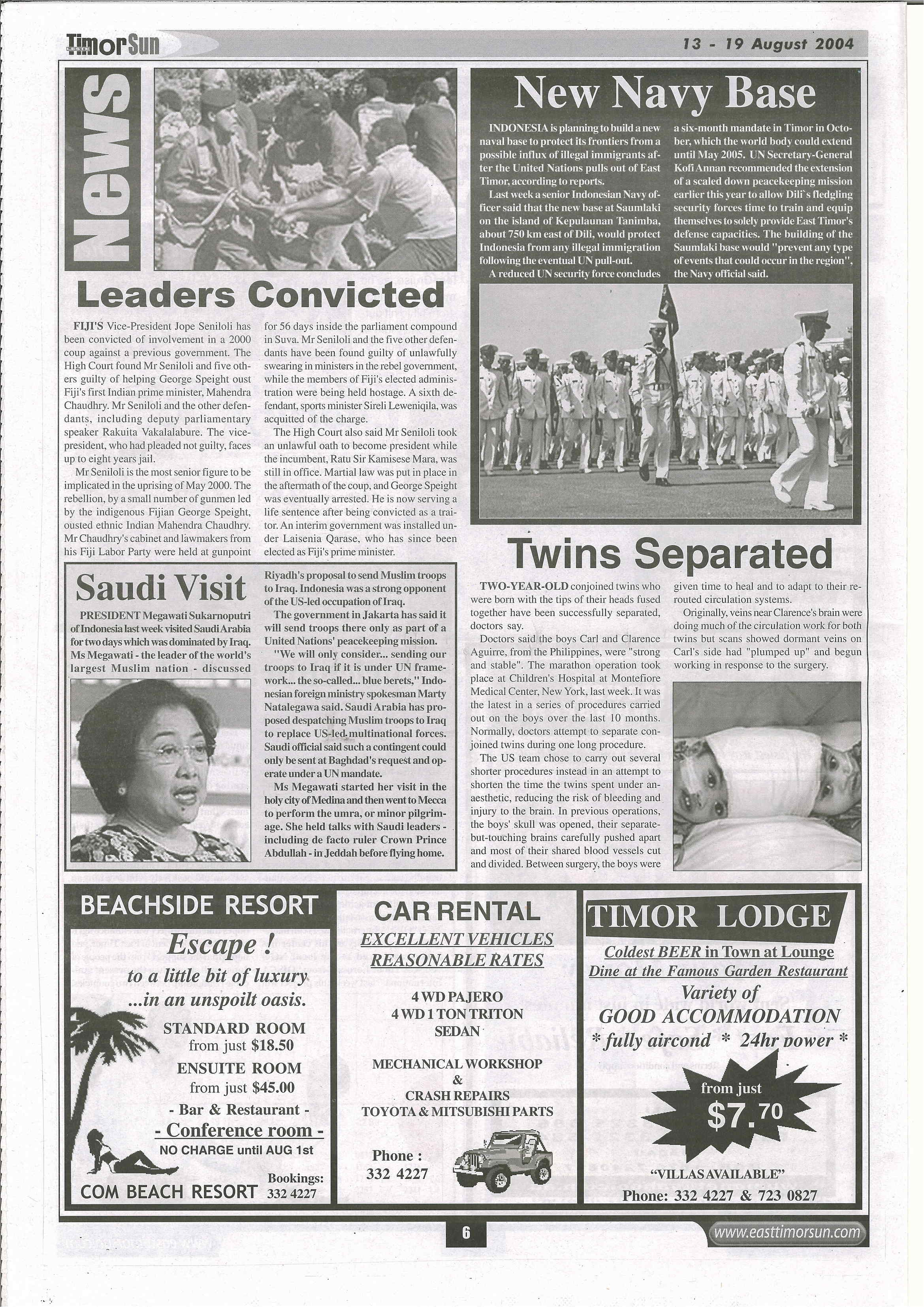 (2004-2004), "Timor Sun", Sexta, 13 de Agosto de 2004 - Quinta, 19 de Agosto de 2004, Fundação Mário Soares / Arquivo da Resistência Timorense - Jornais Timor Telecom, Disponível HTTP: http://www.casacomum.org/cc/visualizador?pasta=10282.002 (2025-12-16)