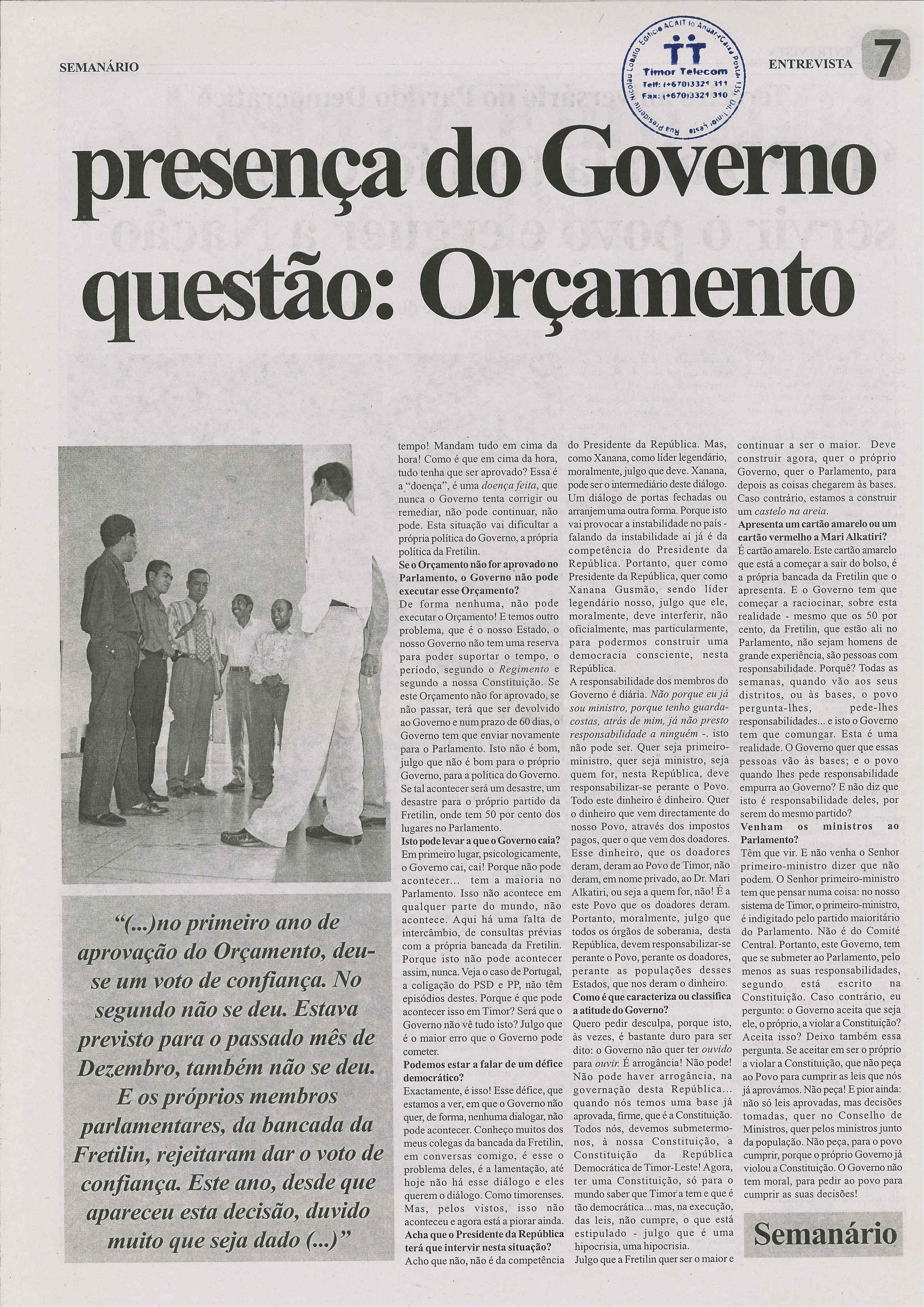 (2004), "Semanário", Sábado, 19 de Junho de 2004, Fundação Mário Soares / Arquivo da Resistência Timorense - Jornais Timor Telecom, Disponível HTTP: http://www.casacomum.org/cc/visualizador?pasta=10262.021 (2025-12-17)