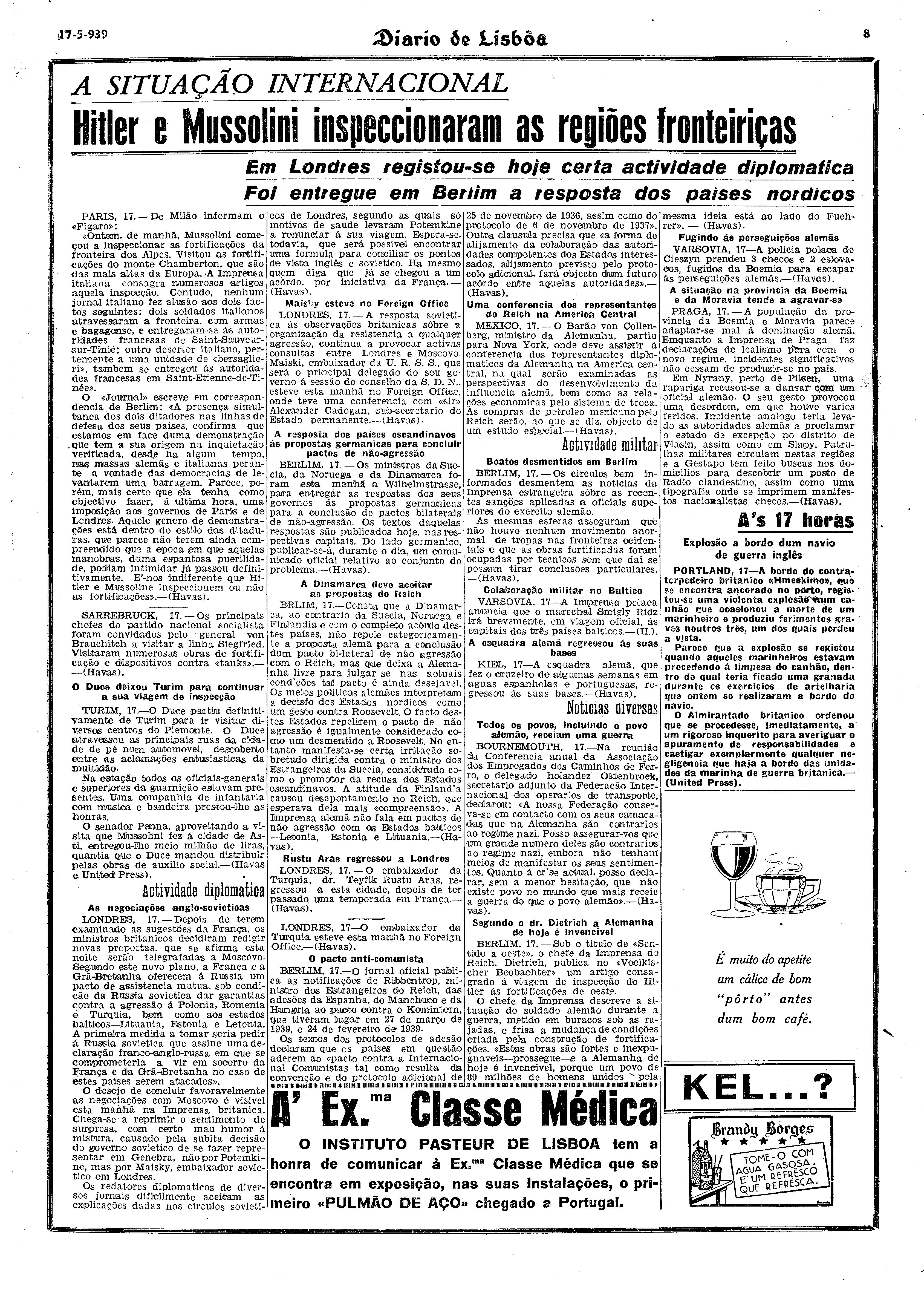 Instituição: Fundação Mário Soares e Maria Barroso Pasta: 05765.029.07278Título: Diário de LisboaNúmero: 5920Ano: 19Data: Quarta, 17 de Maio de 1939Directores: Director: Joaquim MansoFundo: DRR - Documentos Ruella RamosTipo Documental: IMPRENSADireitos: A publicação, total ou parcial, deste documento exige prévia autorização da entidade detentora.