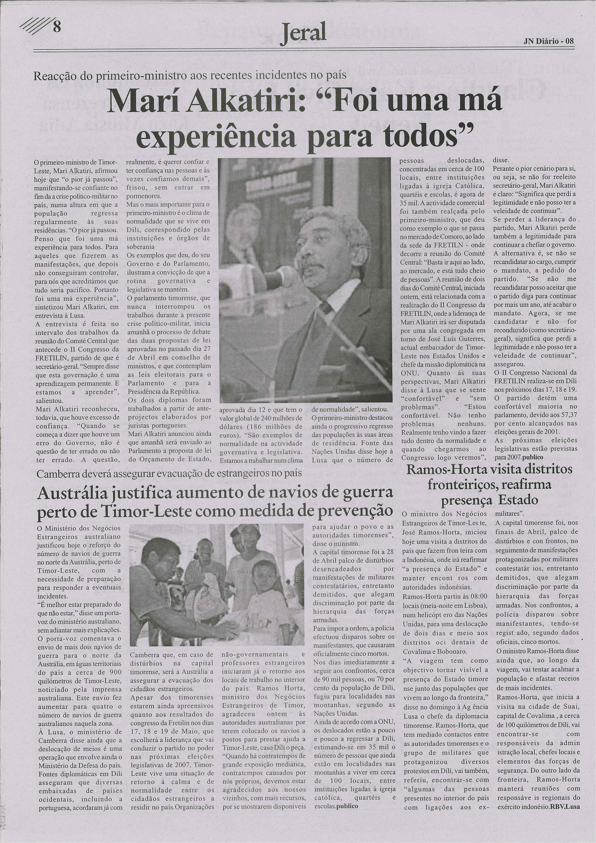 Instituição: Arquivo & Museu da Resistência Timorense Pasta: 10268.081Título: DiárioData: Terça, 16 de Maio de 2006Observações: anúncio na pág. 1; anúncio na pág. 3; anúncio na última página; Fundo: Arquivo da Resistência Timorense - Jornais Timor TelecomTipo Documental: IMPRENSACota Original: DIA_2006_05_16Direitos: A publicação, total ou parcial, deste documento exige prévia autorização da entidade detentora.