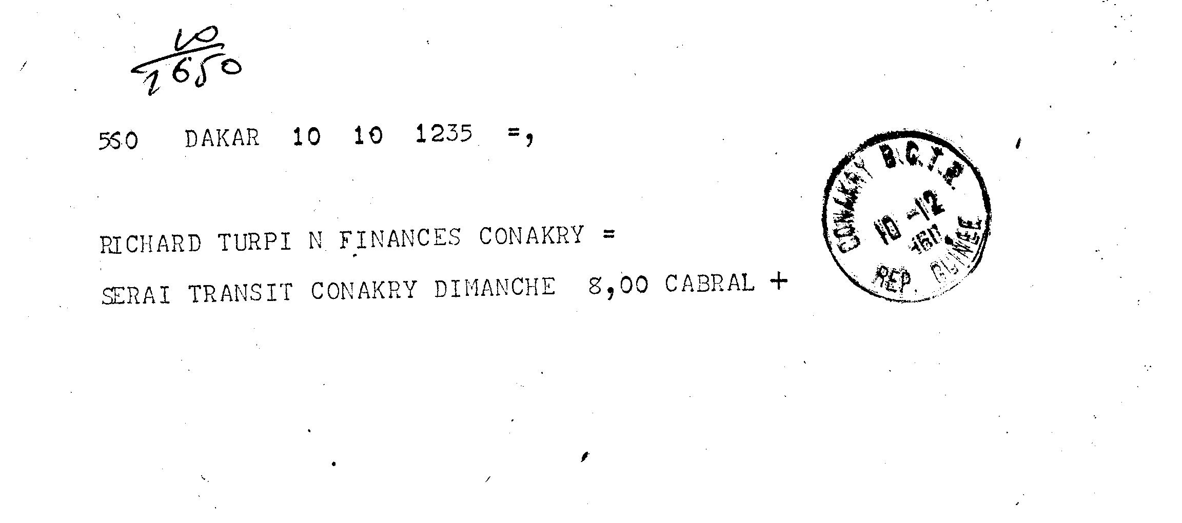 Instituição: Fundação Mário Soares e Maria Barroso Pasta: 07073.131.341Assunto: Informa sobre a sua passagem por Conakry.Remetente: [Amílcar] Cabral, DakarDestinatário: Richard TurpinData: Sábado, 10 de Dezembro de 1960Observações: Doc. incluído no dossier intitulado Telegramas. A capa do documento 07073.131.329 (imagem 1) é a mesma para os documentos até 07073.131.361.Fundo: DAC - Documentos Amílcar CabralTipo Documental: CorrespondenciaDireitos: A publicação, total ou parcial, deste documento exige prévia autorização da entidade detentora.