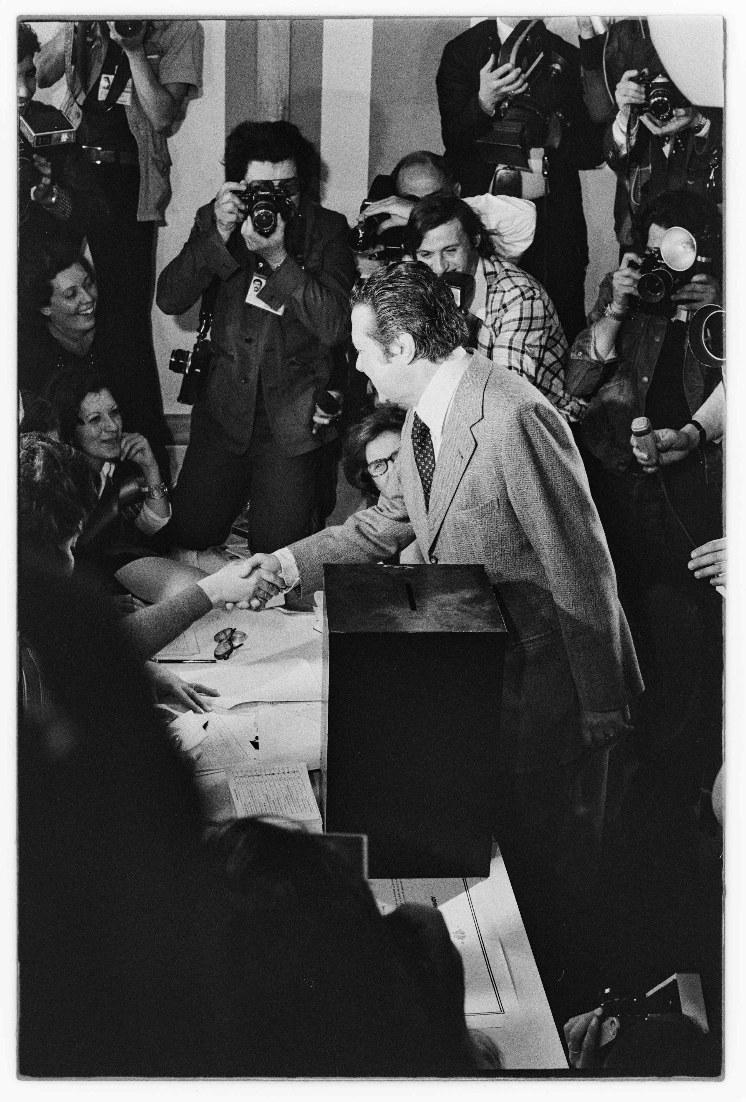 Pasta: 07942.062.006Assunto: Eleições legislativas de 1976. Mário Soares, Secretário-Geral do Partido Socialista (PS), depositando o seu boletim de voto na urna, sob a atenção dos jornalistasAutor: Peter CollisData: domingo, 25 de abril de 1976Opaco/Transparente: TransparenteNegativo/Positivo: NegativoPB/Cor: Preto e BrancoAutor da reprodução: António CoelhoFundo: Peter CollisTipo Documental: FotografiasDireitos: A publicação, total ou parcial, deste documento exige prévia autorização da entidade detentora.