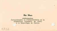 Pasta: 04608.053.117Assunto: Cartão de VisitaRemetente: Ko Hua, Embaixador Extraórdinário e Plenipotenciário da República Popular da China em ConakryDestinatário: Não identificadoFundo: DAC - Documentos Amílcar CabralTipo Documental: Correspondencia Página(s): 2