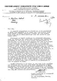 Pasta: 07066.090.023Assunto: Solicita que leve consigo material sobre a luta de libertação nas colónias portuguesas para publicação, na próxima visita à União Soviética. Informa que tem a mesma opinião sobre Belarmino da Silva [MLSTDP].Remetente: Lev Soukhanov, Comité Soviético de Solidariedade Afro-AsiáticaDestinatário: Amílcar Cabral, Partido Africano para a IndependênciaData: Sexta, 4 de Novembro de 1960Fundo: DAC - Documentos Amílcar CabralTipo Documental: Correspondencia Página(s): 1