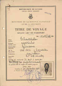 Pasta: 07200.172.014Título: Título de viagemAssunto: Título de viagem de Siminti Anadé, emitido pelo Ministério da Defesa e da Segurança da República da Guiné.Data: Quarta, 5 de Junho de 1968Fundo: DAC - Documentos Amílcar CabralTipo Documental: Documentos Página(s): 1