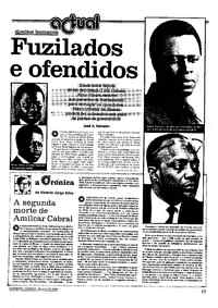 Pasta: 04336.004.007Título: ExpressoAssunto: "Direitos humanos: Fuzilados e ofendidos. A segunda morte de Amílcar Cabral. Os regimes assassinos: mais de 1500 execuções por ano." Nino Vieira.Data: Sábado, 26 de Julho de 1986Fundo: Arquivo Mário Pinto de AndradeTipo Documental: IMPRENSA Página(s): 5