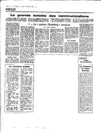 Pasta: 04349.004.010Título: Le MondeAssunto: "Presse - La grande bataille des communications" (Imorensa - a grande luta das comunicações)Autor do artigo: Claude DurieuxData: Quinta, 12 de Fevereiro de 1981Fundo: Arquivo Mário Pinto de AndradeTipo Documental: IMPRENSA Página(s): 2