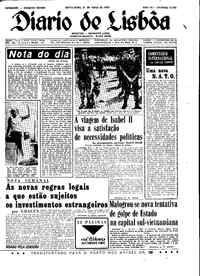 Pasta: 06560.098.19594Título: Diário de LisboaNúmero: 15248Ano: 45Data: Sábado, 29 de Maio de 1965Directores: Director: Norberto Lopes; Director Adjunto: Mário NevesEdição: 3ª ediçãoFundo: DRR - Documentos Ruella RamosTipo Documental: IMPRENSA Página(s): 17