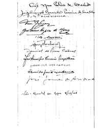 Pasta: 02969.057.003Título: Saudação assinada por indivíduos reunidos em jantar de confraternização no 1º aniversário do MUDAssunto: Saudação, assinada por diversos indivíduos (um grupo de rapazes que não concorda com o RDM que proíbe aos militares que se manifestem), reunidos em jantar de confraternização no 1º aniversário do MUD.Data: Terça, 8 de Outubro de 1946Fundo: DMJ - Documentos 50º MUD JuvenilTipo Documental: Documentos Página(s): 2