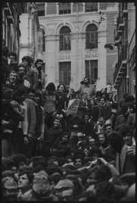 Pasta: 07337.000.003Título: Revolução de 25 de Abril de 1974Assunto: Populares no Largo do Carmo durante o cerco ao quartel da GNR, em que se encontrava refugiado Marcelo Caetano. Distinguem-se João Soares, Pedro Coelho (de megafone) e Francisco Sousa Tavares.Autor: Carlos GilInscrições: Informação original: 1974-1984 (conjunto).Data: Quinta, 25 de Abril de 1974Fundo: Carlos GilTipo Documental: Fotografias Página(s): 1
