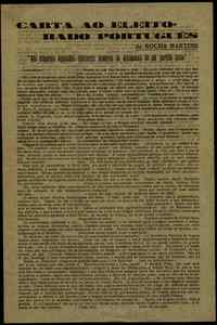 Pasta: 09768.050Título: Carta ao Eleitorado Português de Rocha MartinsAssunto: Panfleto com reprodução de artigo de Rocha Martins no jornal República, de 13 de Novembro de 1945, denunciando a farsa das eleições para deputados, e mandado imprimir pela comissão concelhia de Barcelos do MUD.Data: c. Novembro de 1945Fundo: Alberto PedrosoTipo Documental: Documentos Página(s): 8