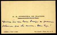 Pasta: 09770.040Assunto: Cartão de visita agradecendo envio de palavras.Remetente: A. A. Ferreira de MacedoDestinatário: [Alexandre Vieira]Data: s.d.Fundo: Alberto PedrosoTipo Documental: Correspondencia Página(s): 1