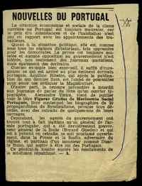Pasta: 09769.095Título: Nouvelles du PortugalAssunto: Artigo de Alexandre Vieira em publicação não identificada. Contém monograma manuscrito do próprio no canto superior direito.Data: s.d.Fundo: Alberto PedrosoTipo Documental: Documentos Página(s): 2