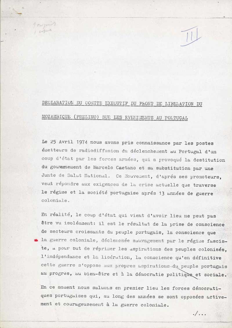 Déclaration du Comité Exécutif du Front de Libération du Mozambique (FRELIMO) sur les Évènements au Portugal