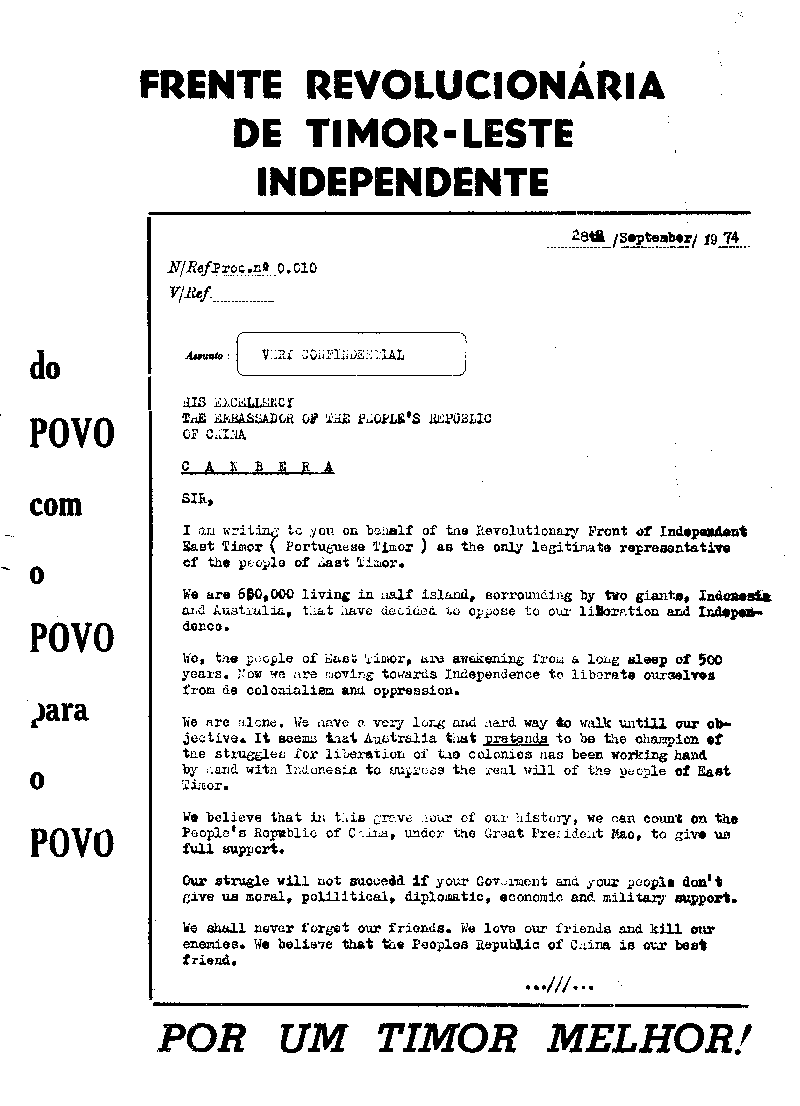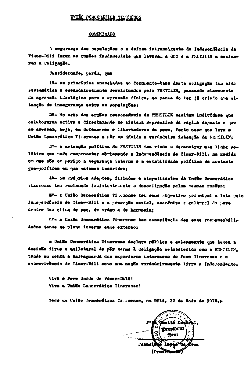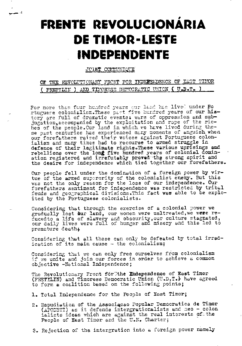 Posteriormente, e apesar da Assembleia Geral das Nações Unidas, através da resolução 1514 (XV) de 14 de Dezembro de 1960, ter considerado Timor Português como um Território Não Autónomo sob administração portuguesa, a verdade é que, diferentemente dos territórios africanos, só na sequência da revolução dos cravos é que emergiram os primeiros movimentos políticos na então província ultramarina.