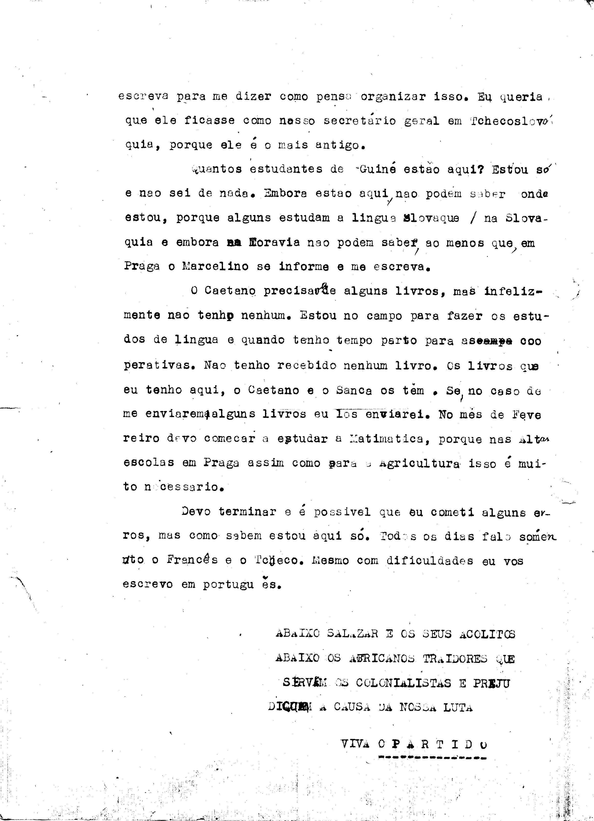 Instituição: Fundação Mário Soares e Maria Barroso Pasta: 04604.038.001Assunto: Falecimento de Fernando e Linco. Envio de documentos para serem publicados no jornal de Holesov. Ida a Praga, Marcelino Goya. Estudo da língua e das cooperativas.Remetente: Alexandre Nunes [Correia], Holesov [Checoslováquia]Destinatário: Direcção do PAIData: Segunda, 1 de Janeiro de 1962Observações: Doc. Incluído no dossier intitulado Correspondência 1962 (interna PAIGC, MPLA, FRELIMO, UGEAN, CONCP).Fundo: DAC - Documentos Amílcar CabralTipo Documental: CorrespondenciaDireitos: A publicação, total ou parcial, deste documento exige prévia autorização da entidade detentora.