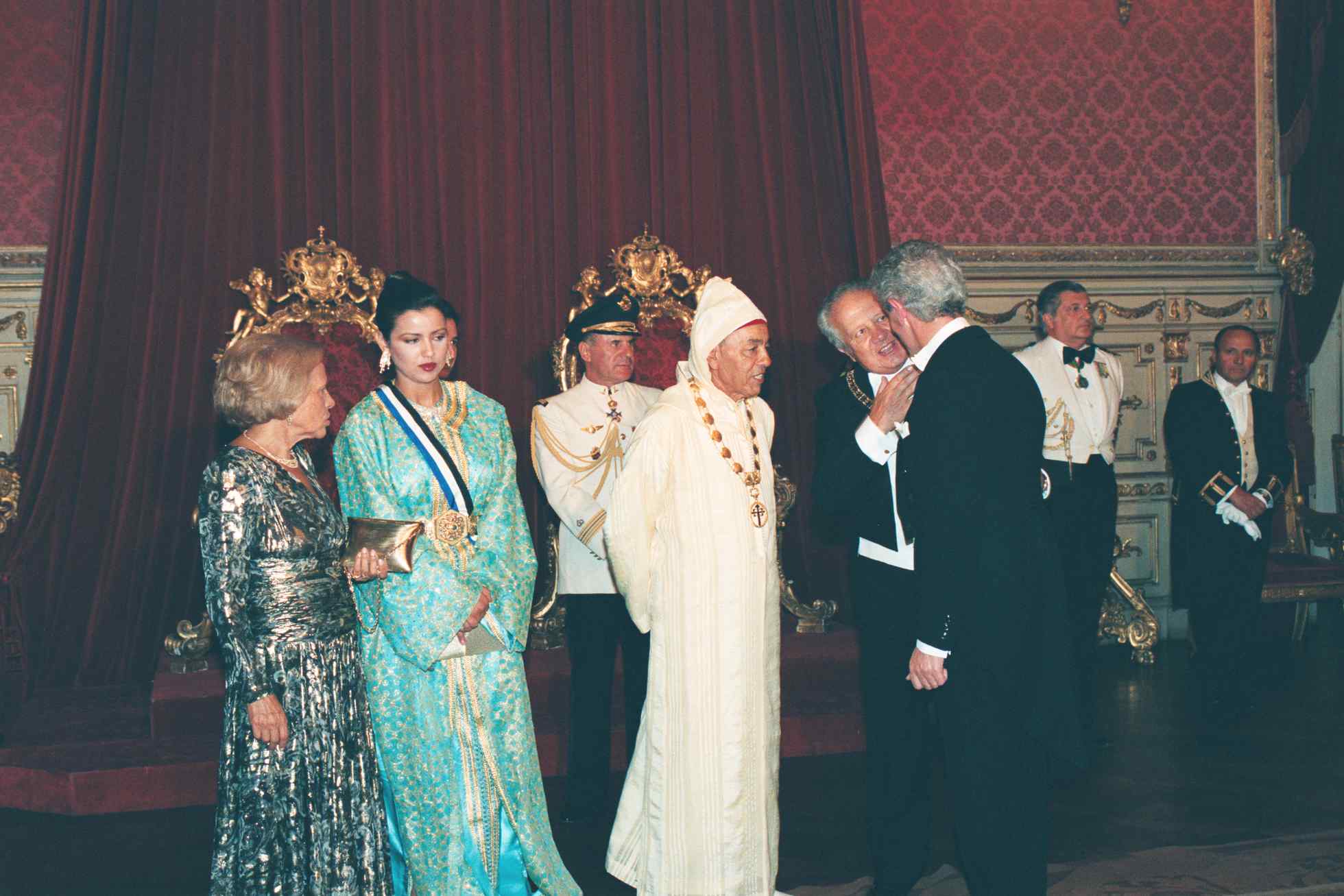 Instituição: Fundação Mário Soares e Maria Barroso Pasta: 05118.012Assunto: Visita do Rei Hassan II de Marrocos; jantar de gala no Palácio da Ajuda; Embaixador de Marrocos; apresentação de cumprimentos: D. Duarte Pio, , casal Sampaio, entre outros; retratos do casal Soares com o Rei Hassan II e a sua esposa, Lalla Latifa Hammou.Autor: Jorge BrilhanteData: Setembro de 1993Negativo/Positivo: NegativoPB/Cor: CorDimensões da Imagem: 24 x 36 mmFundo: AMS - Arquivo Mário SoaresTipo Documental: FotografiasDireitos: A publicação, total ou parcial, deste documento exige prévia autorização da entidade detentora.
