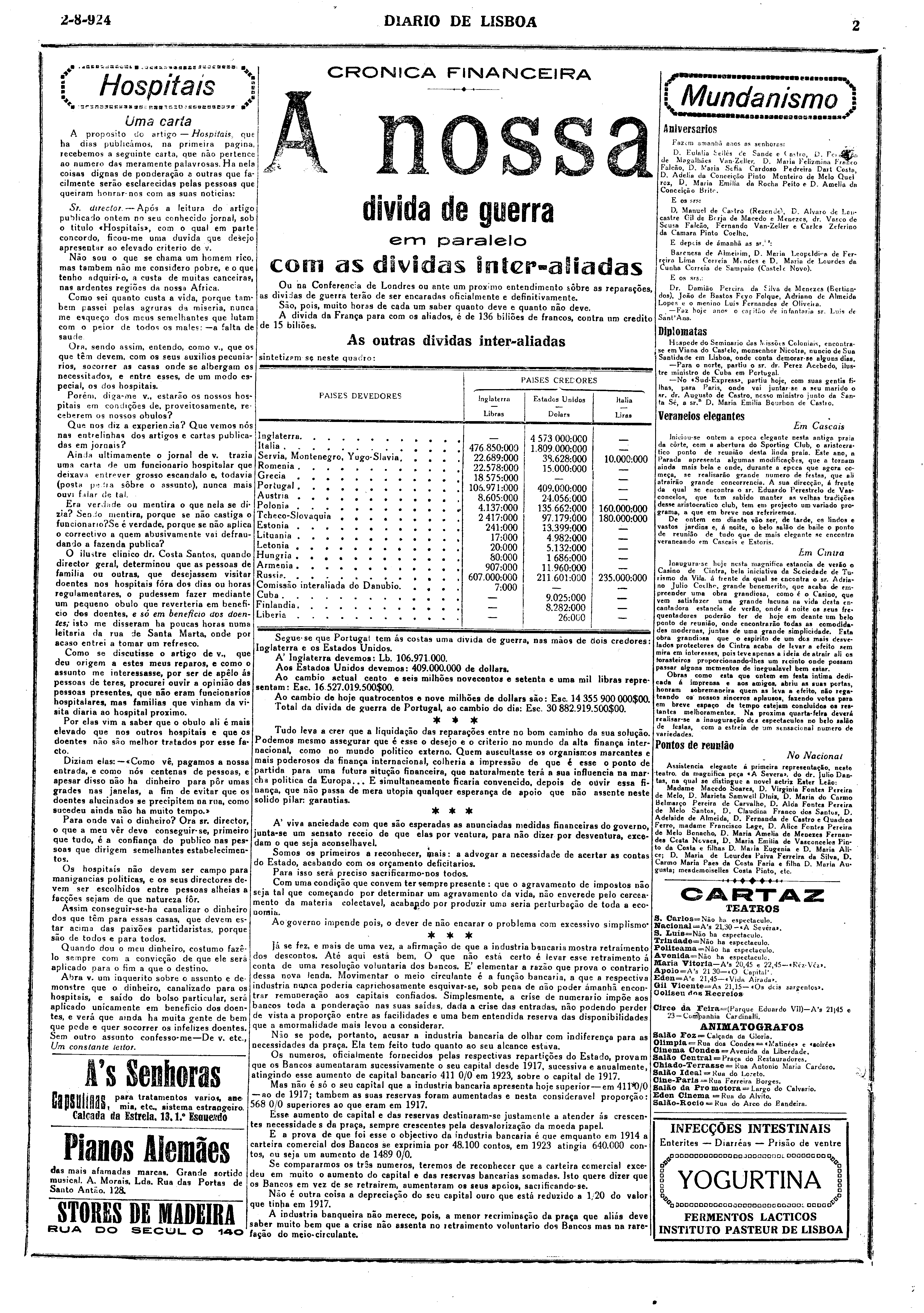 Instituição: Fundação Mário Soares e Maria Barroso Pasta: 05741.005.01300Título: Diário de LisboaNúmero: 1019Ano: 4Data: Sábado, 2 de Agosto de 1924Directores: Director: Joaquim MansoFundo: DRR - Documentos Ruella RamosTipo Documental: IMPRENSADireitos: A publicação, total ou parcial, deste documento exige prévia autorização da entidade detentora.