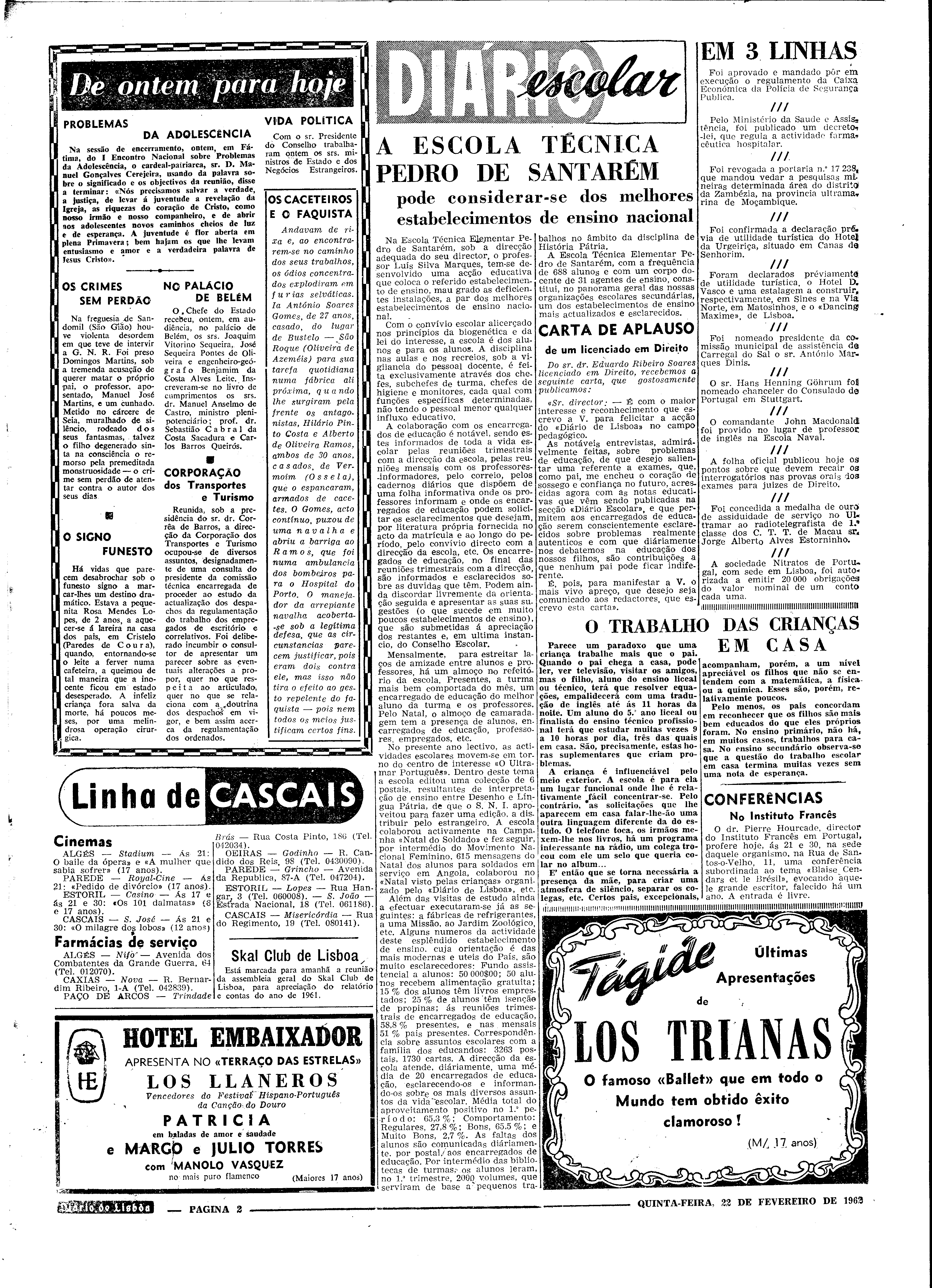 Instituição: Fundação Mário Soares e Maria Barroso Pasta: 06545.083.17697Título: Diário de LisboaNúmero: 14079Ano: 41Data: Quinta, 22 de Fevereiro de 1962Directores: Director: Norberto Lopes; Director Adjunto: Mário NevesObservações: Inclui supl. "Vida Literária e Artística".Fundo: DRR - Documentos Ruella RamosTipo Documental: IMPRENSADireitos: A publicação, total ou parcial, deste documento exige prévia autorização da entidade detentora.
