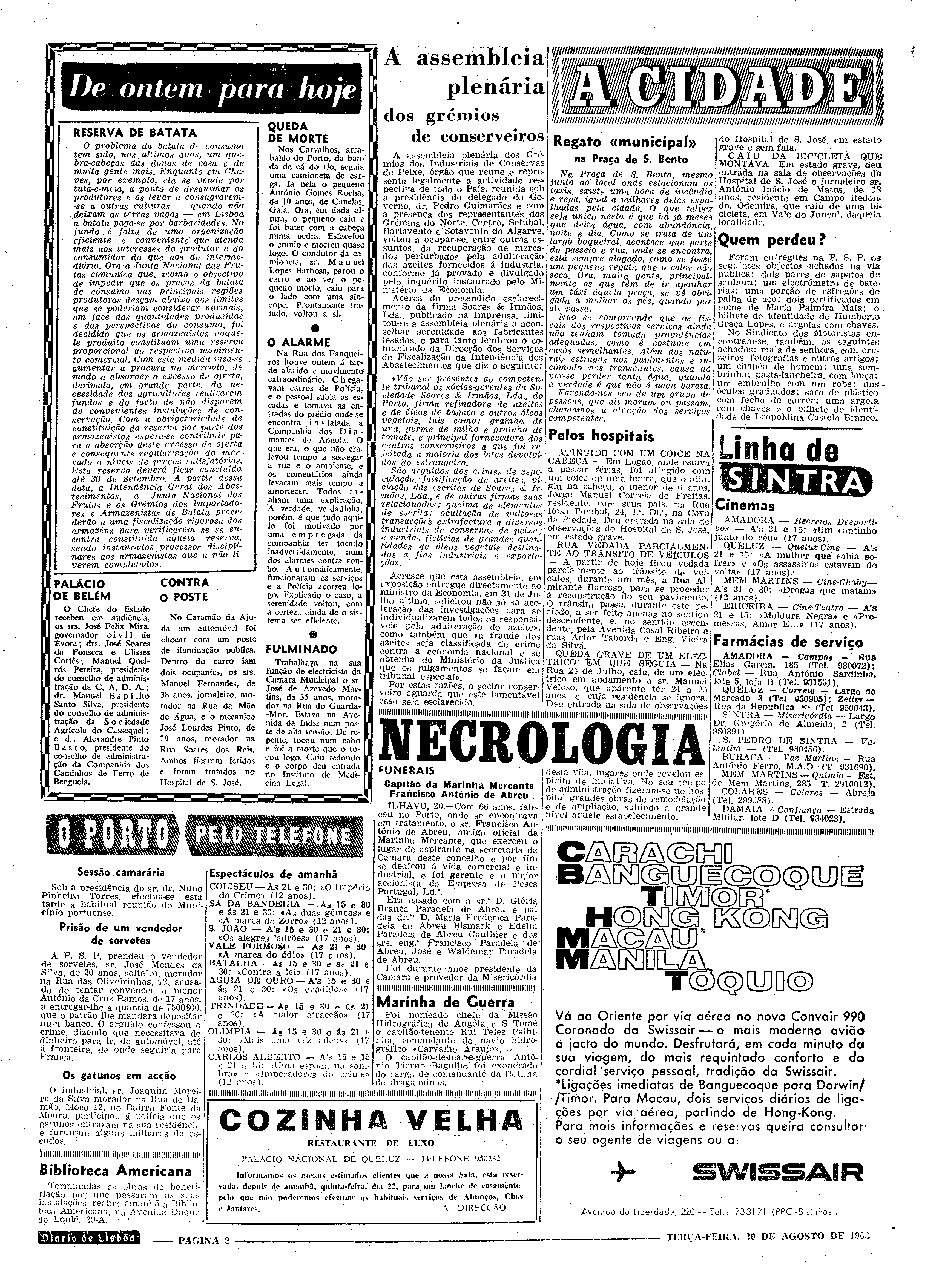 Instituição: Fundação Mário Soares e Maria Barroso Pasta: 06550.088.18446Título: Diário de LisboaNúmero: 14613Ano: 43Data: Terça, 20 de Agosto de 1963Directores: Director: Norberto Lopes; Director Adjunto: Mário NevesObservações: Inclui supl. "Exito", "Diário de Lisboa Juvenil".Fundo: DRR - Documentos Ruella RamosTipo Documental: IMPRENSADireitos: A publicação, total ou parcial, deste documento exige prévia autorização da entidade detentora.