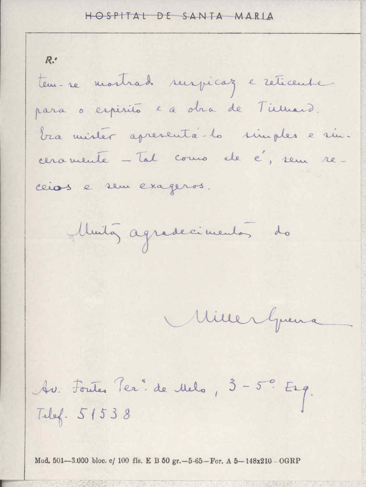 Instituição: Fundação Mário Soares e Maria Barroso Pasta: 07514.063.001Assunto: Agradece carta de Felicidade Alves. Desejo de Miller Guerra e da mulher em se inscreverem no Círculo Teilhard de Chardin.Remetente: Miller GuerraDestinatário: José da Felicidade AlvesData: s.d.Fundo: DFL - Documentos Felicidade AlvesTipo Documental: CorrespondenciaDireitos: A publicação, total ou parcial, deste documento exige prévia autorização da entidade detentora.