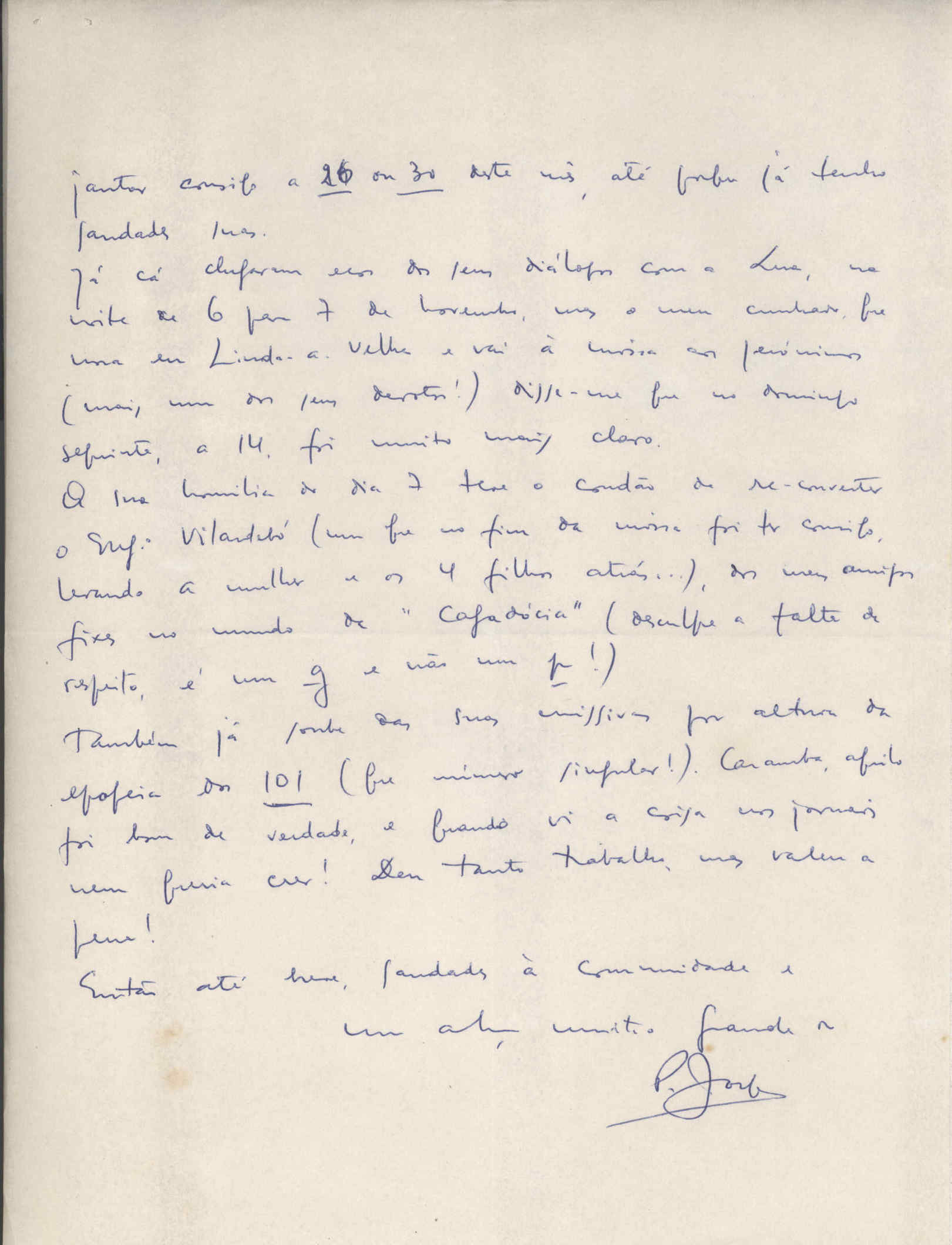 Instituição: Fundação Mário Soares e Maria Barroso Pasta: 07515.093.001Assunto: Menciona encontro em Cacilhas com Felicidade Alves, em que abordaram o pensamento de Teilhard de Chardin. Menção à actividade de Felicidade Alves em Belém, nomeadamente ao carácter das suas homilias, referindo também as suas missivas por altura da "epopeia dos 101" [referência a manifesto de um grupo de católicos].Remetente: P. Jorge [António Jorge Martins]Destinatário: José da Felicidade AlvesData: Sábado, 20 de Novembro de 1965Fundo: DFL - Documentos Felicidade AlvesTipo Documental: CorrespondenciaDireitos: A publicação, total ou parcial, deste documento exige prévia autorização da entidade detentora.