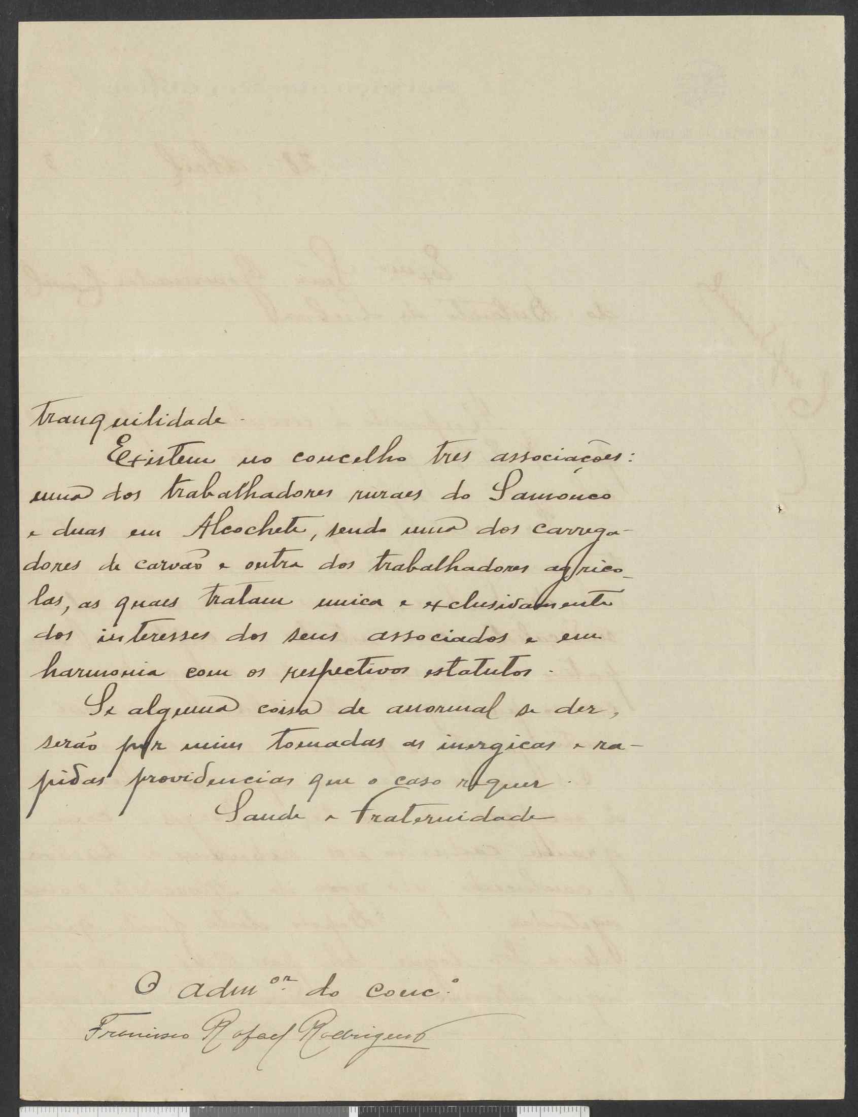 (1913), "Carta do Administrador do Concelho de Alcochete", Fundação Mário Soares / Rodrigo José Rodrigues, Disponível HTTP: http://www.casacomum.org/cc/visualizador?pasta=09515.002.006.005 (2025-11-3)