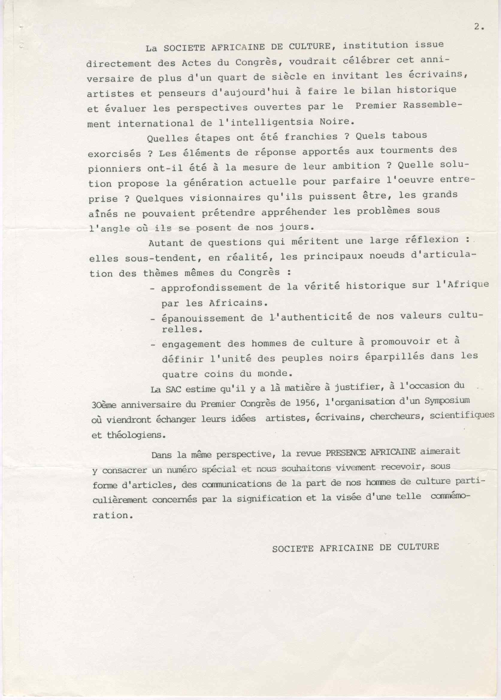 Instituição: Fundação Mário Soares e Maria Barroso Pasta: 10189.004.007Assunto: 30.º Aniversário do I Congresso de Escritores e Artistas Negros.Remetente: Societé Africaine de Culture (Présence Africaine)Destinatário: Mário Pinto de AndradeData: Julho de 1985Fundo: Arquivo Mário Pinto de AndradeTipo Documental: CorrespondenciaDireitos: A publicação, total ou parcial, deste documento exige prévia autorização da entidade detentora.