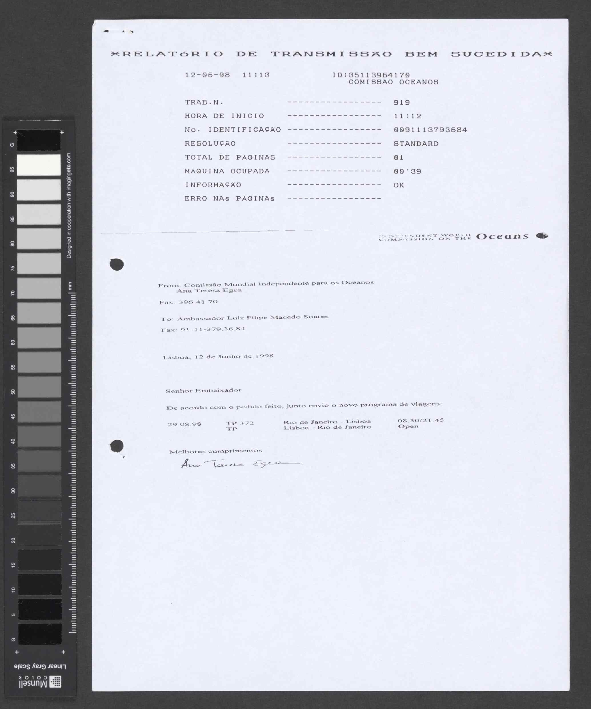 Instituição: Fundação Mário Soares e Maria Barroso Pasta: 10215.009.004Assunto: Fax de Ana Teresa Egea dirigido ao embaixador Luiz Filipe de Macedo Soares a informar sobre agendamento dos voos no âmbito da Sessão Final da CMIO em Lisboa. Inclui relatório de transmissão bem sucedida.Remetente: Ana Teresa EgeaDestinatário: Luiz Filipe de Macedo SoaresData: sexta, 12 de junho de 1998Fundo: Comissão Mundial Independente para os OceanosTipo Documental: CorrespondenciaLíngua do Documento: PortuguêsDireitos: A publicação, total ou parcial, deste documento exige prévia autorização da entidade detentora.