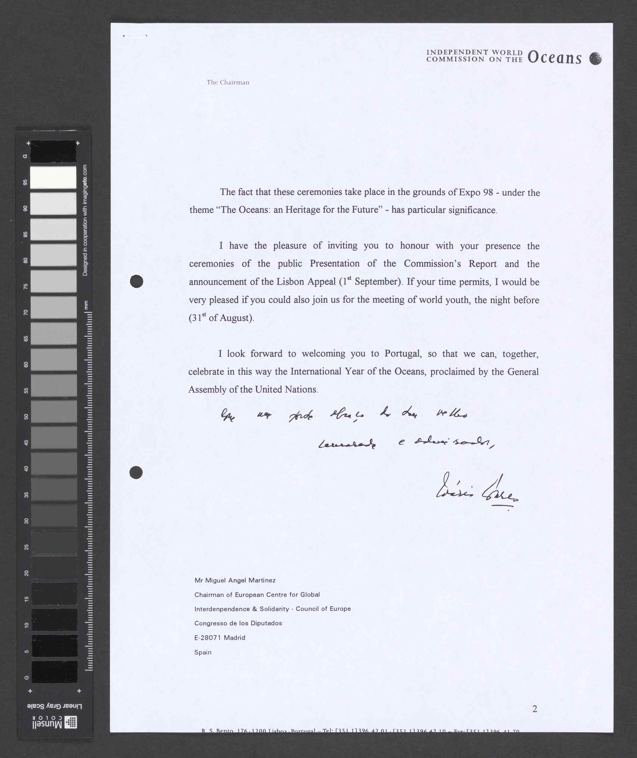 Instituição: Fundação Mário Soares e Maria Barroso Pasta: 10239.012.001Assunto: Carta de Mário Soares dirigida a Miguel Angel Martinez, Presidente do Centro Europeu Global Para a Interdependência e Solidariedade, convidando-o para as cerimónias de apresentação pública do Relatório da Comissão e da Declaração de Lisboa, a 1 de setembro de 1998.Remetente: Mário SoaresDestinatário: Miguel Angel MartinezData: quinta, 30 de abril de 1998Fundo: Comissão Mundial Independente para os OceanosTipo Documental: CorrespondenciaLíngua do Documento: InglêsDireitos: A publicação, total ou parcial, deste documento exige prévia autorização da entidade detentora.