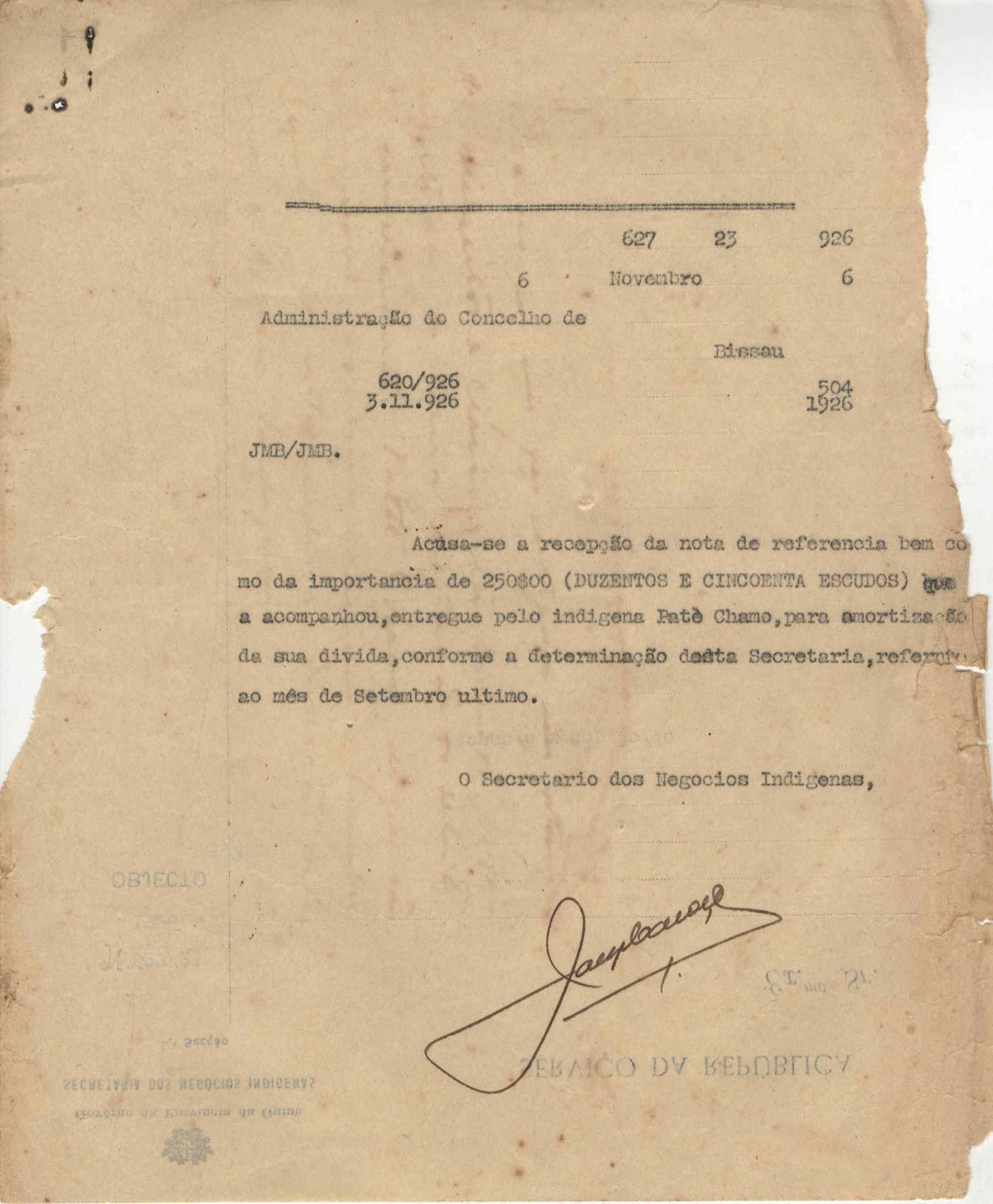 (1926-1927), "1926 e 27: dívidas cobradas pela Direcção dos Serviços e Negócios Indígenas", Fundação Mário Soares / C1.6 - Secretaria dos Negócios Indígenas, Disponível HTTP: http://www.casacomum.org/cc/visualizador?pasta=10418.021 (2025-12-27)