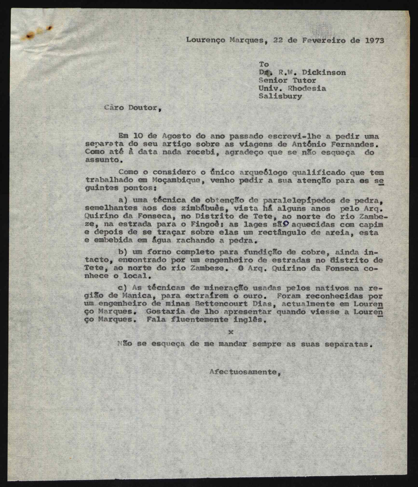 (1972-1973), "Troca de correspondência entre António Rita-Ferreira e R. W. Dickinson, Universidade da Rodésia", Fundação Mário Soares / António Rita-Ferreira, Disponível HTTP: http://www.casacomum.org/cc/visualizador?pasta=10470.033 (2025-12-7)