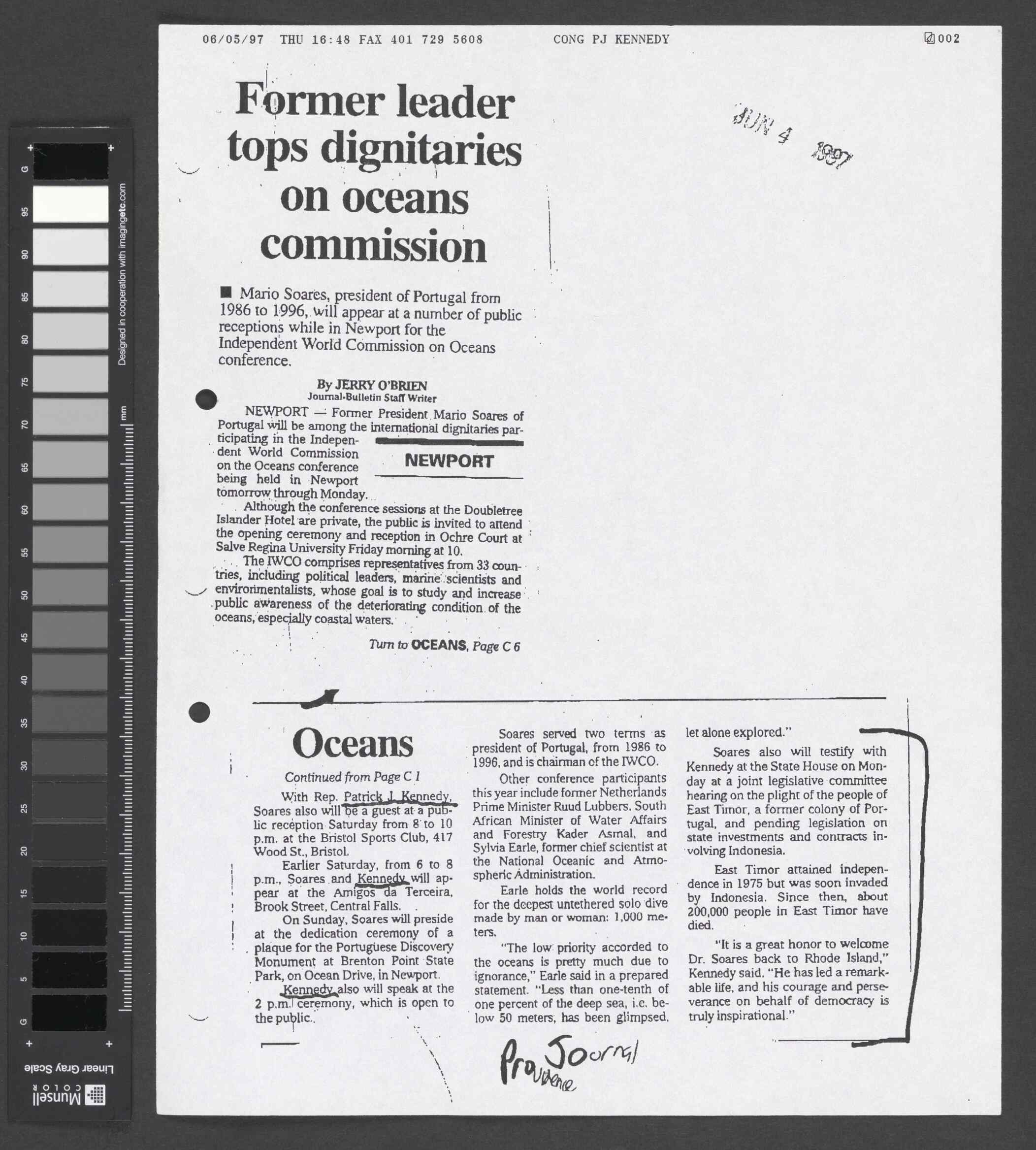 Instituição: Fundação Mário Soares e Maria Barroso Pasta: 10654.002.003Assunto: Cópias de recortes de imprensa do Providence Journal Bulletin de 7 de junho de 1997.Data: sábado, 7 de junho de 1997Observações: Documento incluído em separador intitulado "Contributions".Fundo: Comissão Mundial Independente para os OceanosTipo Documental: DocumentosLíngua do Documento: InglêsDireitos: A publicação, total ou parcial, deste documento exige prévia autorização da entidade detentora.