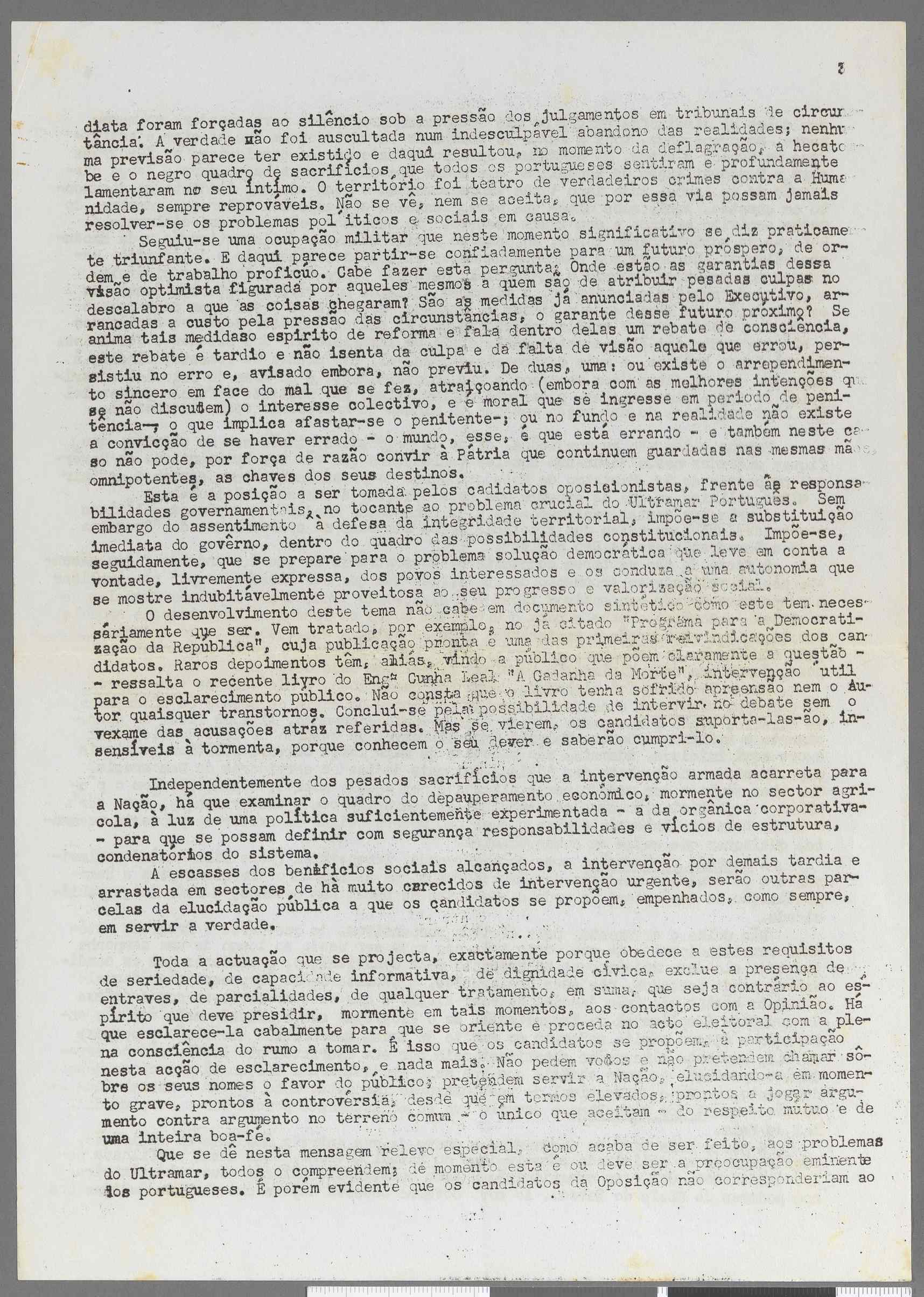Instituição: Fundação Mário Soares e Maria Barroso Pasta: 04700.001.001Título: À Nação. Manifesto dos oposicionistas[...]Assunto: Manifesto dos oposicionistas, republicanos, candidatos a deputados pelos círculos de Aveiro, Braga, Castelo Branco, Coimbra, Leiria, Lisboa, Porto e SantarémData: Sábado, 14 de Outubro de 1961 - Quarta, 18 de Outubro de 1961Observações: 2 versões de conteúdo semelhante em diferente impressão e data, uma contendo a lista dos subscritores. [Cfr. Alfredo Ribeiro dos Santos, 02587.021.005]Fundo: Francisco Lyon de CastroTipo Documental: DocumentosDireitos: A publicação, total ou parcial, deste documento exige prévia autorização da entidade detentora.