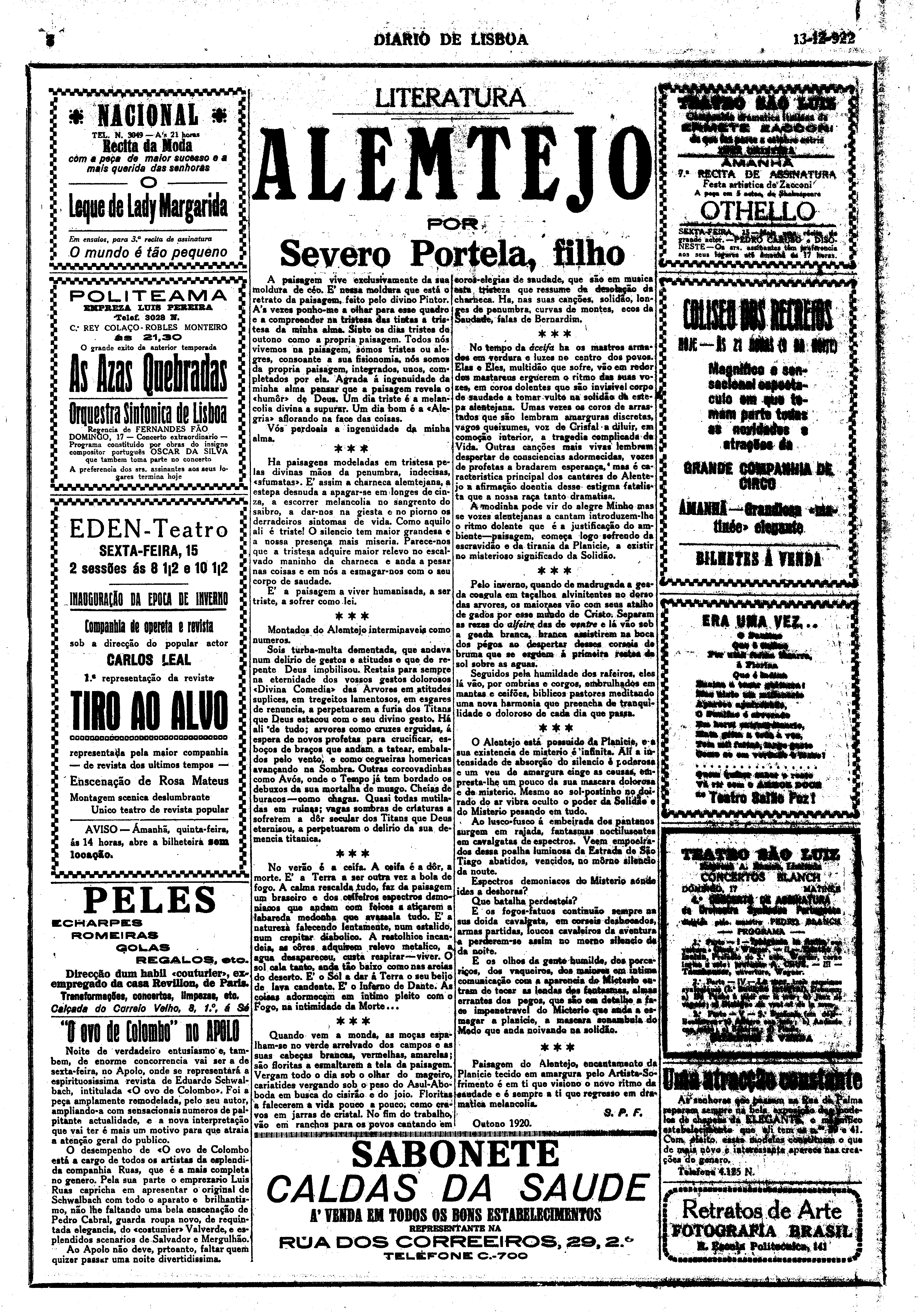 Instituição: Fundação Mário Soares e Maria Barroso Pasta: 05740.004.00798Título: Diário de LisboaNúmero: 518Ano: 2Data: Quarta, 13 de Dezembro de 1922Directores: Director: Joaquim MansoFundo: DRR - Documentos Ruella RamosTipo Documental: IMPRENSADireitos: A publicação, total ou parcial, deste documento exige prévia autorização da entidade detentora.