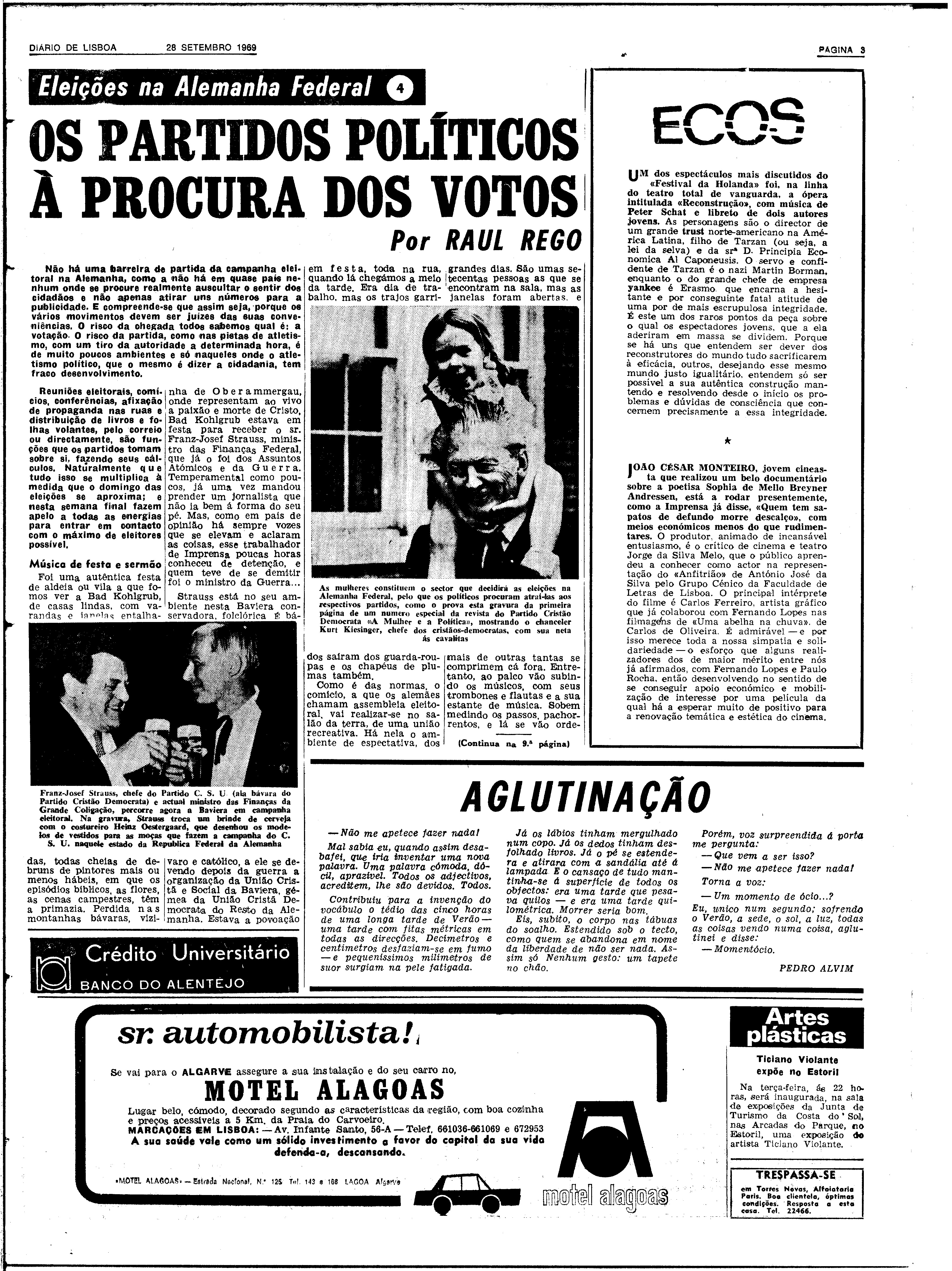 Instituição: Fundação Mário Soares e Maria Barroso Pasta: 06605.143.24048Título: Diário de LisboaNúmero: 16802Ano: 49Data: Domingo, 28 de Setembro de 1969Directores: Director: António Ruella RamosEdição: 1ª ediçãoFundo: DRR - Documentos Ruella RamosTipo Documental: IMPRENSADireitos: A publicação, total ou parcial, deste documento exige prévia autorização da entidade detentora.