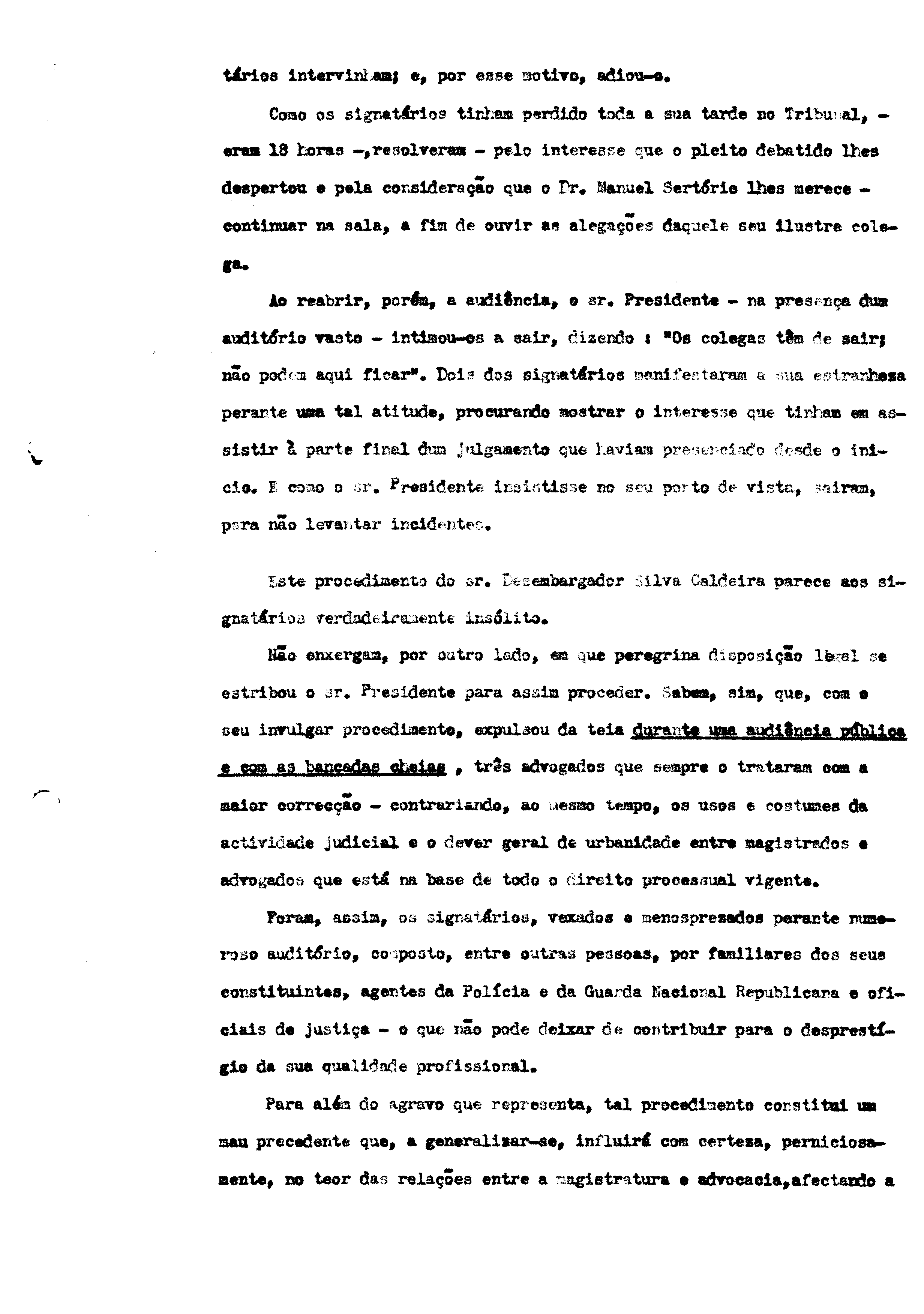 Instituição: Fundação Mário Soares e Maria Barroso Pasta: 00345.003.001Assunto: Cópia de carta de Duarte Vidal, Mário Soares e Xancora Camotim para Pedro Pitta, expondo o facto de terem sido expulsos pelo desembargador Silva Caldeira de uma audiência no tribunal.Remetente: Duarte Vidal, Mário Soares e Xancora CamotimDestinatário: Pedro Pitta, Presidente da Ordem dos AdvogadosData: Quarta, 4 de Novembro de 1959Fundo: AMS - Arquivo Mário SoaresTipo Documental: CorrespondenciaDireitos: A publicação, total ou parcial, deste documento exige prévia autorização da entidade detentora.