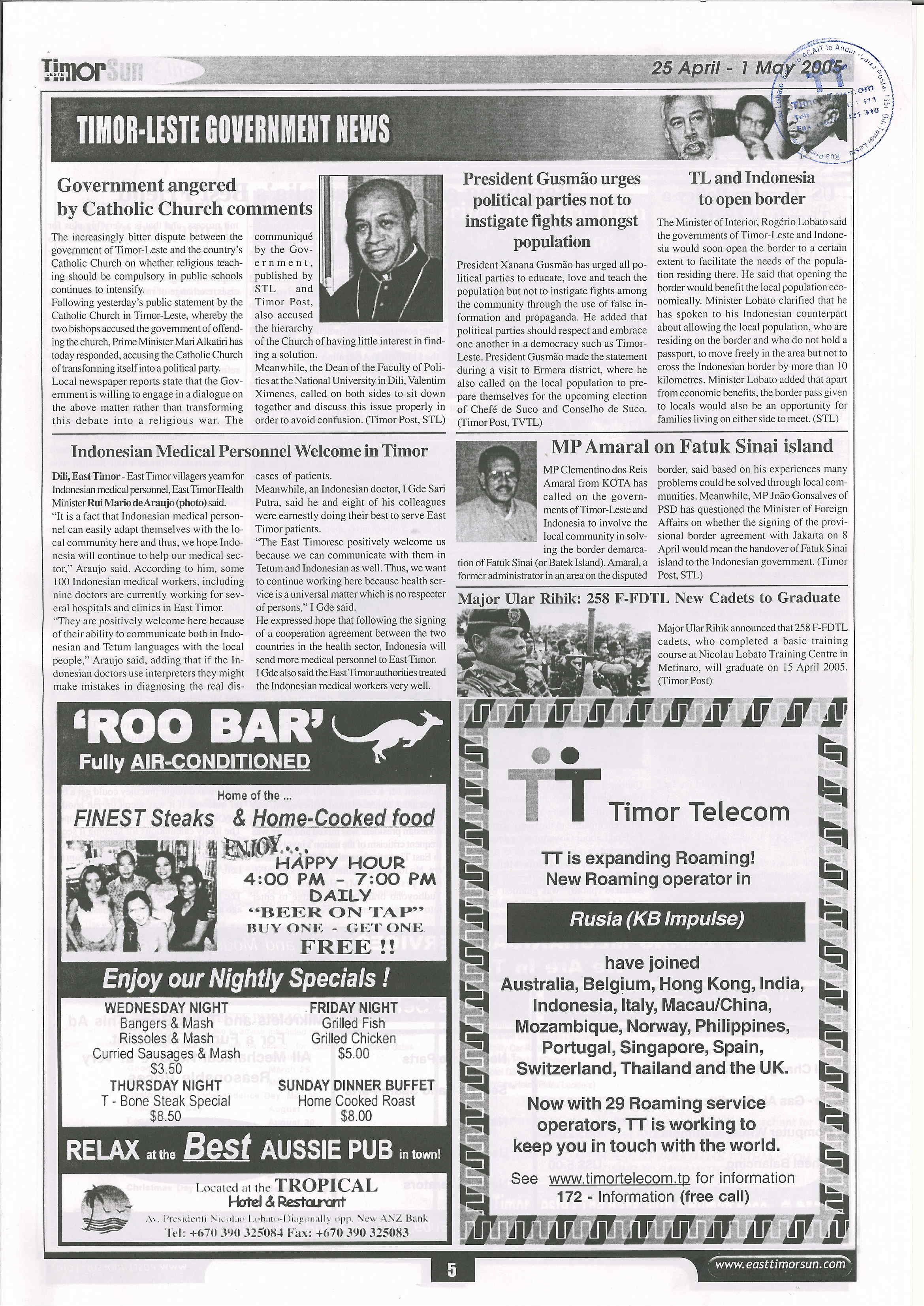 (2005-2005), "Timor Sun", Segunda, 25 de Abril de 2005 - Domingo, 1 de Maio de 2005, Fundação Mário Soares / Arquivo da Resistência Timorense - Jornais Timor Telecom, Disponível HTTP: http://www.casacomum.org/cc/visualizador?pasta=10283.010 (2025-12-26)