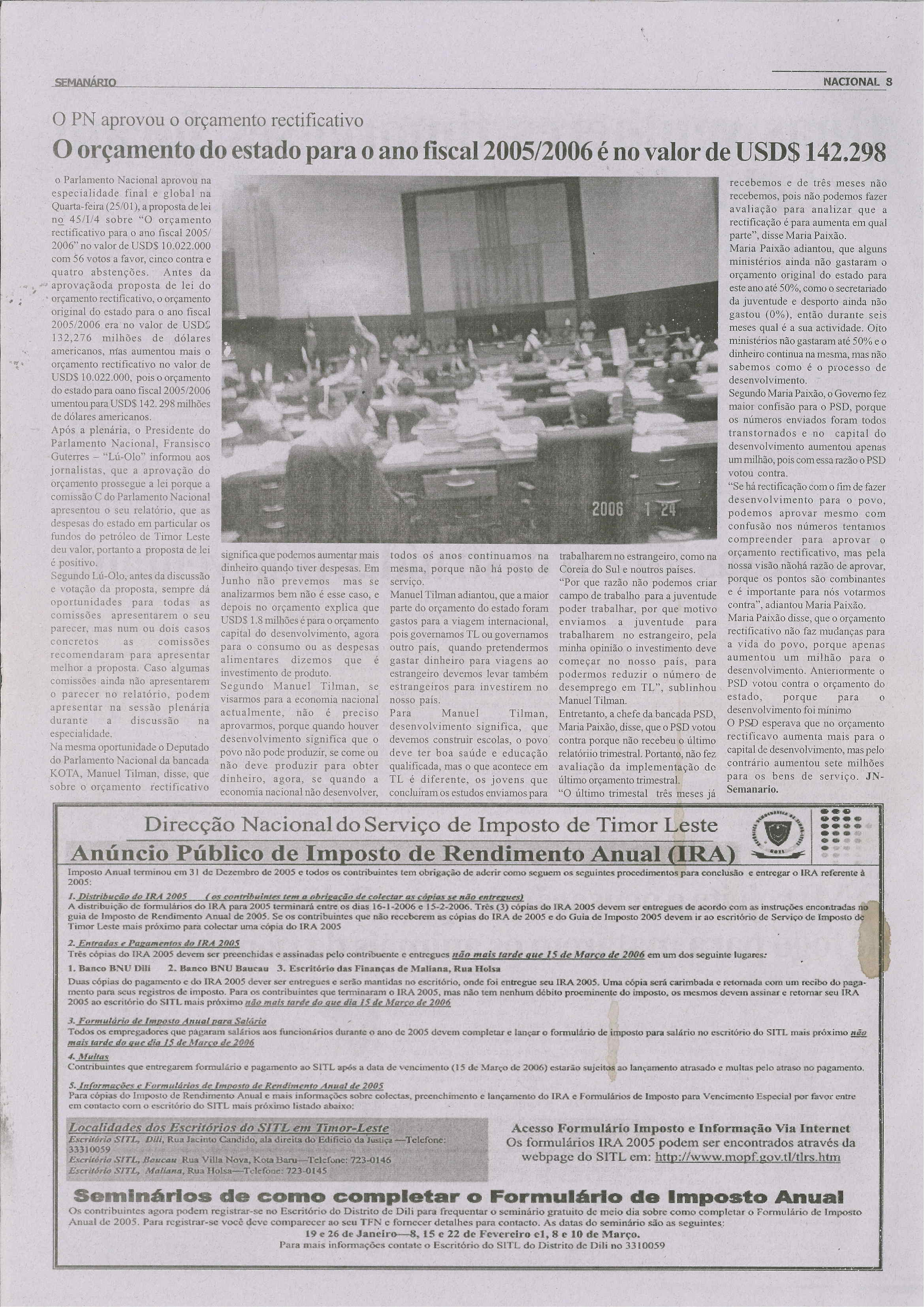 (2006), "Semanário", Sábado, 28 de Janeiro de 2006, Fundação Mário Soares / Arquivo da Resistência Timorense - Jornais Timor Telecom, Disponível HTTP: http://www.casacomum.org/cc/visualizador?pasta=10264.004 (2025-12-25)